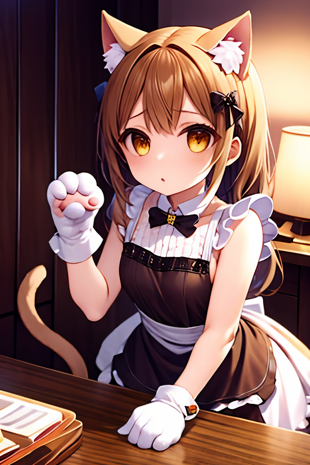 1girl,outfit,cocoa\(coffee\),table,animal hands maid dress with cat ears,pet pose,(detailed paws),animal gloves,