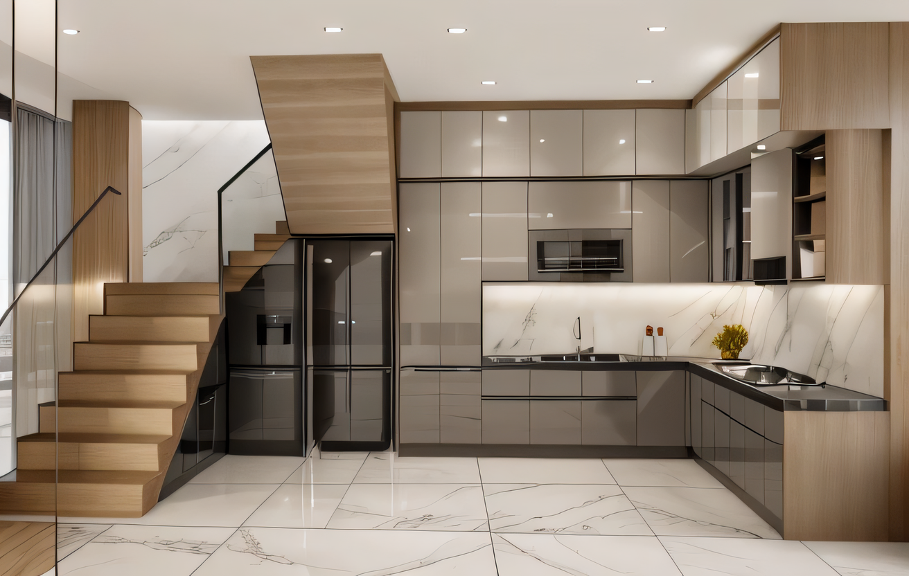 modern living room and kitchen interior design in a villa, ultra-realistic, super high quality render, 8k
