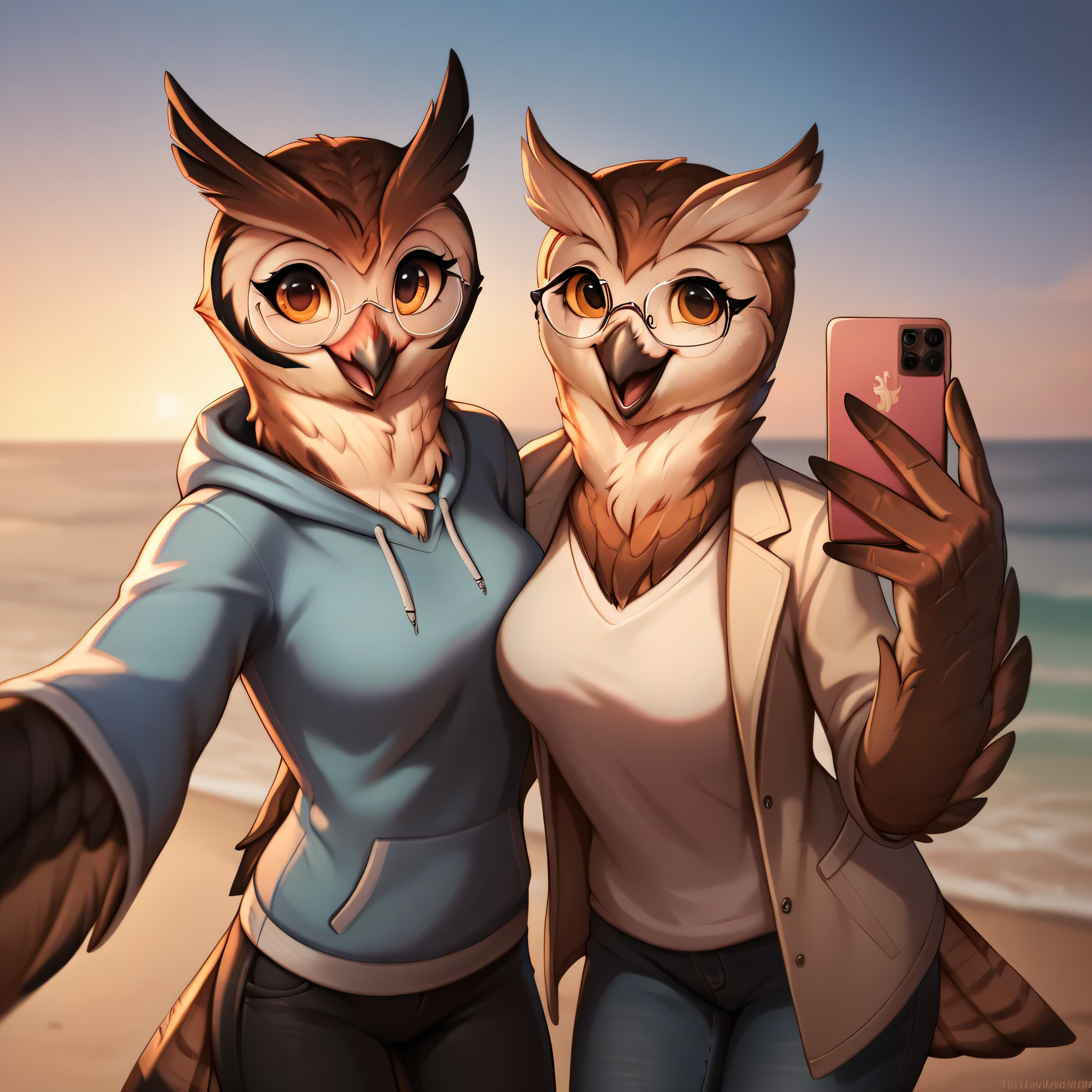 score_9, score_8_up, score_7_up, score_6_up, score_5_up, source_furry, anthro, bird, avian, (owl), ((duo)), female, shirt, sweatshirt, pants, (detailed background), outside, coat, sea, (smile, happy, happy expression), expressive, hi res, highly detailed, 8k, detailed feathers, feathers, selfie, taking a selfie, gesture, detailed eyes, brown feathers, white feathers, black feathers, detailed, winged arms, feather hands, adult, realistic feathers, eyelashes, (glasses), eyewear, beak