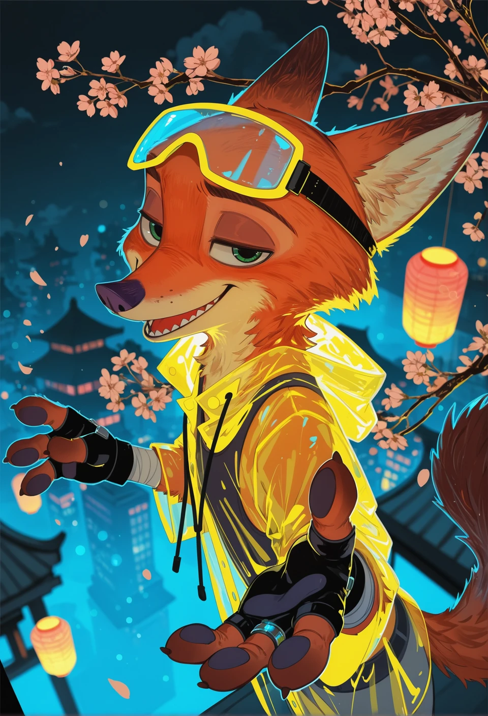 2d, anthropomorphic, bodies, yellow eyes, lobo , black hooded sweater, a few yen, with a cup of coffee in his right hand, skinny physique, happy