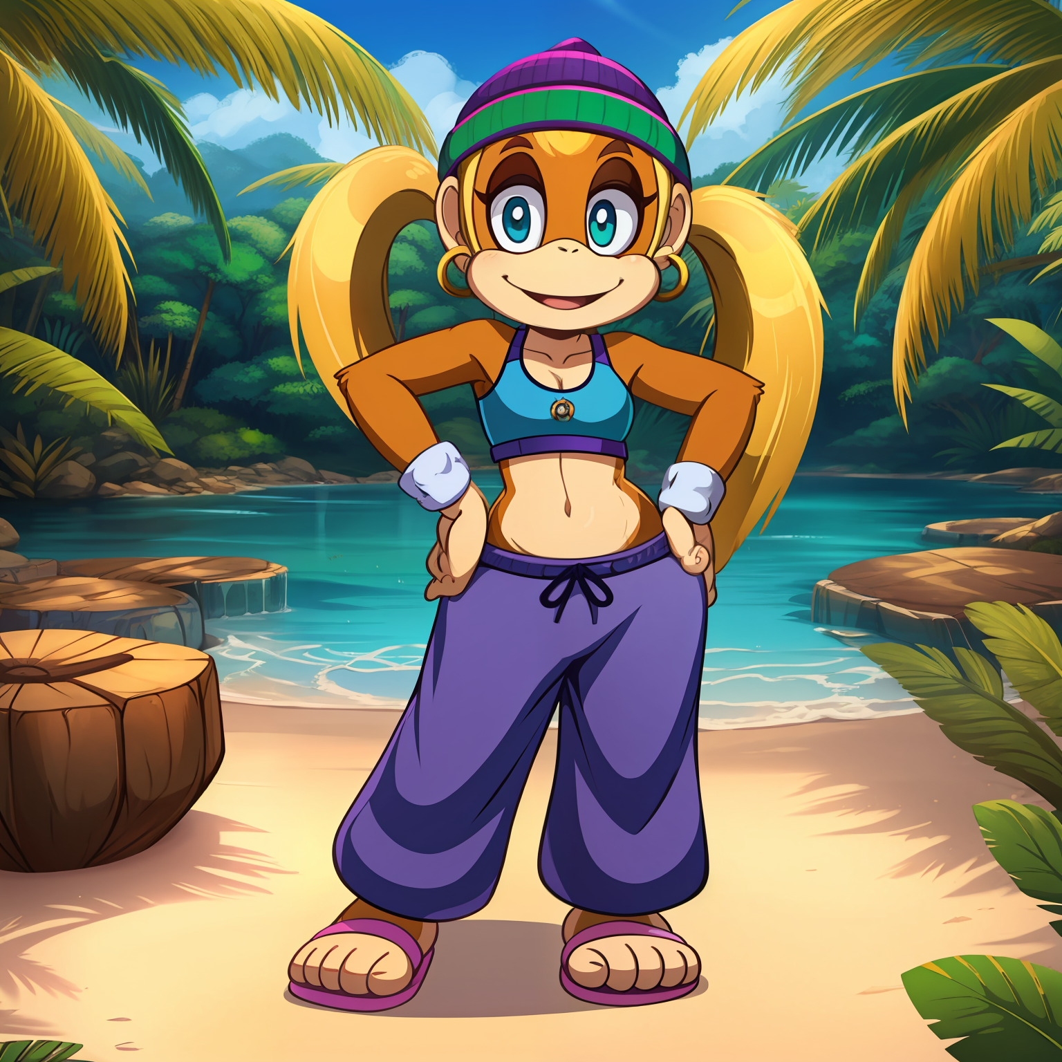 [Tiny Kong], [Uploaded to e621.net; (Pixelsketcher), (wamudraws)}, ((masterpiece)), ((HD)), ((high res)), ((solo portrait)), ((full body)), ((back view)), ((lower-angle view)), ((ground-up POV)), ((feet visible)), ((furry; anthro)), ((detailed fur)), ((detailed shading)), ((beautiful render art)), ((intricate details)), {anthro monkey; brown fur, (two nostrils), (cute blue eyes), (short eyelashes), blonde hair, twintails, (pink nails),(perfect hands, perfect ), chubby, chubby girl, curvy, , lips, plump, thick thighs, thighs, (((oversized gigantic stomach)), curvy, , lips, plump, thick thighs, thighs, (((oversized gigantic stomach)), curvy, , lips, plump, thick thighs, thighs, (((oversized gigantic stomach)) (surprised expression)}, {(blue sports bra), (white flower print on sports bra), (blue sweatpants), (purple beanie), (green stripes on beanie), (hoop earrings)}, {(on picnic blanket), (), (looking back), (looking at viewer)}, [background; (tropical forest), (grass plains), (blue sky), (sun rays), (ambient lighting)]