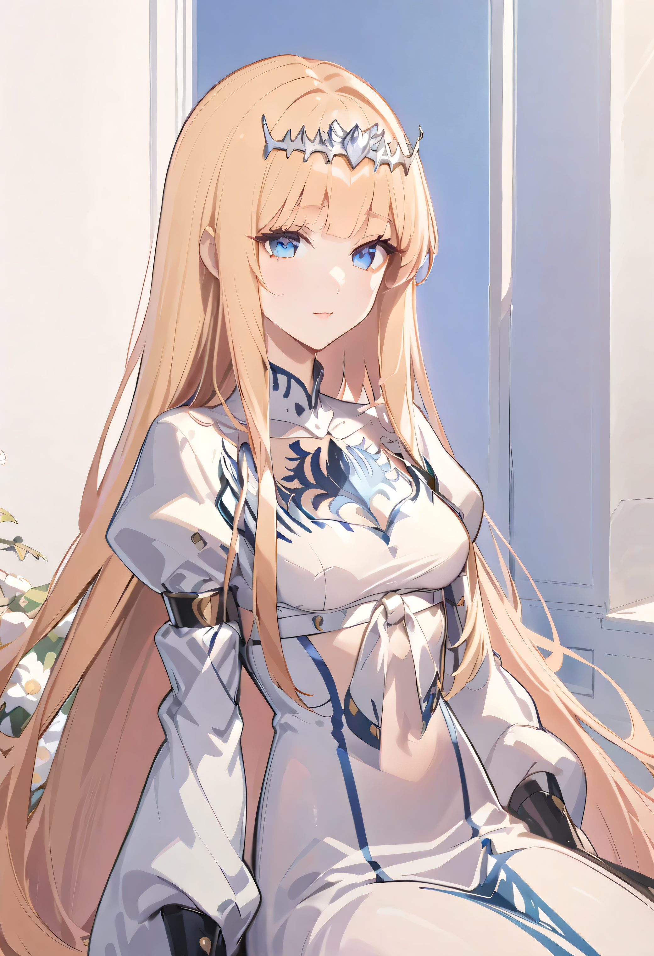 (masterpiece, best quality, 8K HD, colorful ink painting, watercolor splashing pencil drawing), Calca Bessarez, blonde hair, extremely long hair, white tiara, white dress, blunt bangs, (enormous white wings:1.3), (very big wings:1.2), (upper wings:1.1), light blue eyes, solo, 25 years old, mature female, a beautiful smiling girl, her hands on her cheeks, sunflowers and wildflowers on her hair, anime style, full body portrait, detailed character design, complex clothing and design, digital art style, white background