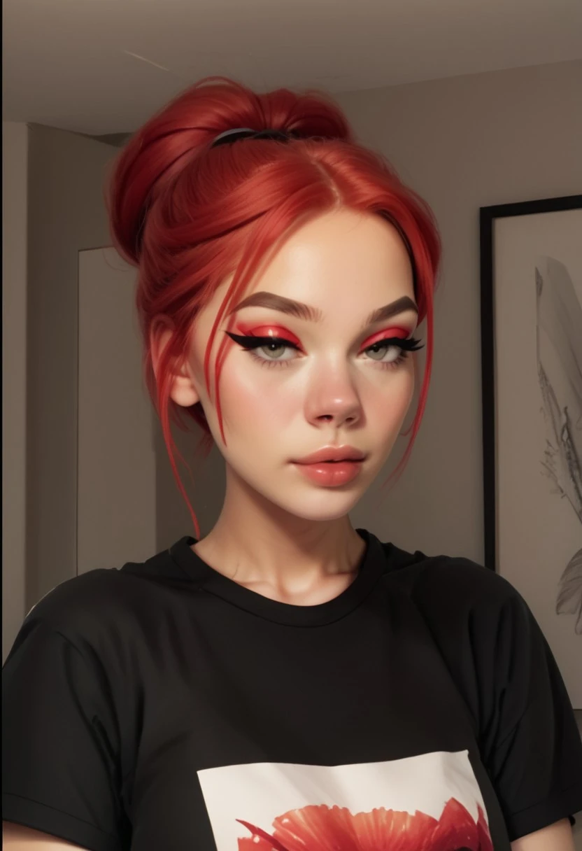 cute beautiful skinny blonde girl with big lips, freckles, with blue eyes,  with long straight hair and bangs in a short black sweater with an open shoulder,  in short white shorts , wearing white high-heeled sneakers with thick white socks. she shows off her tight