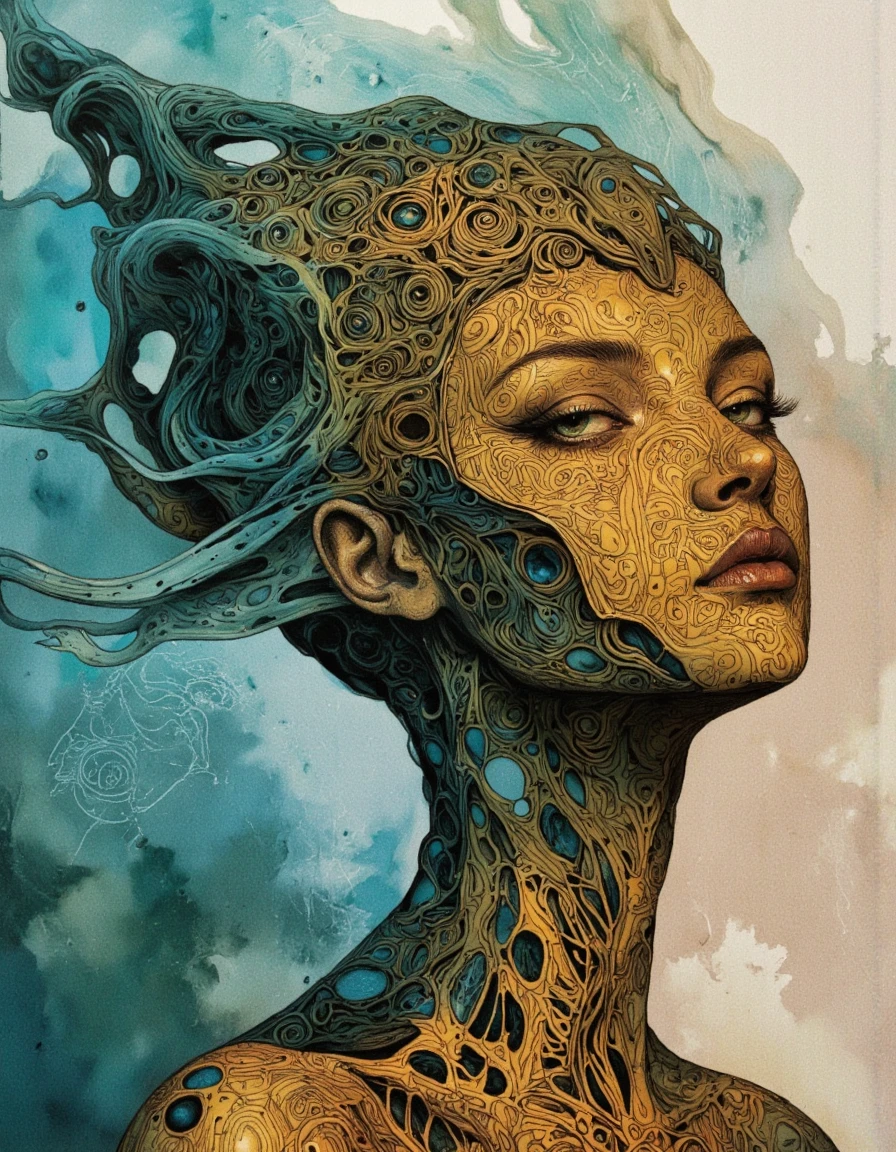 The narrow room has a very high ceiling. In the background, there is a cast-iron spiral staircase in the corner. A young asthenic girl in a blue evening dress with a train stands on the stairs.The long train falls to the floor in beautiful folds. Old paint, cracks, dust, debris. Huge dusty window, Bohemian photo style. Tim Walker/Vogue photo style.A beautiful young European woman stands at the window.
