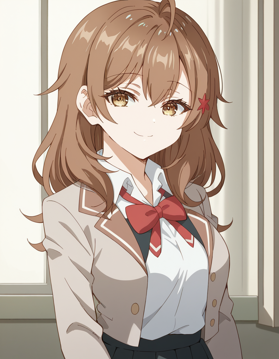score_9, score_8_up, score_7_up, anime screencap, source_anime, 1girl, solo, mariamikhailovnakujou, mariamikhailovnakujou, long hair, bangs, brown hair, hair ornament, right side ornament, hair between eyes, brown eyes, ahoge, smile, false teeth on skin, parted lips, short jacket, brown jacket, green bow tie, white shirt, black vest, buttons, long sleeves, pleated skirt, black skirt, (black thighs: 1.2), finger to mouth, arm behind back, standing, looking at viewer, cowboy shot, classroom, blurred background, indoor, (Beautiful and : 1.0), natural ,