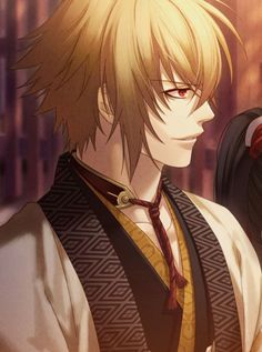“High resolution, best quality, masterpiece, Ultra Fine, very detailed, beauty. digital art style. he is a handsome young adult male character. he has short black hair and eyes mixed red and gold, he has slightly pointed pixie ears with braided earrings. He is pale、he is tall and has a thin macho physique. he has a challenging smile and peeking just a little bit out of his slightly open lips. his nails are slightly long and have black polish on his hands、his clothes are unique and look like a mix of kimono and Japanese armor. He looks up from his lower back and looks at me at Jin Wang standing It's there. He holds a beautiful Japanese sword. He has a mysterious charm. Japanese-style fantasy with an overall strange atmosphere. The background is a Japanese castle and multiple flags. Focus on the character. he is alone and there are no other characters.”