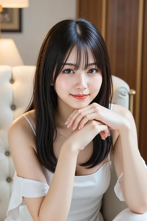 sakura, , Cleavage, a highly detailed, ultra-realistic digital illustration of a beautiful young Asian female merchant standing confidently inside a well-equipped horse-drawn trade wagon traveling through a rugged mountainous forest, inspired by classic fantasy RPGs. She is captured in a medium close-up shot, ensuring her entire head is visible with appropriate headroom while focusing on her from the thighs up. Her long, flowing black hair is slightly tousled and tied back in a practical low ponytail, with loose strands and delicate bangs framing her bright, calculating face. Her sharp, attentive eyes gleam with the golden reflection of daylight filtering through the wagon’s canvas flaps, and her expression is confident, composed, and business-savvy. She wears a classic yet stylish merchant's outfit—featuring a tailored, earth-toned jacket with brass buttons over a cream linen blouse, the neckline modest but neatly laced. A rich burgundy vest with subtle embroidery and a wide leather belt equipped with coin pouches, ledgers, and a sheathed dagger wraps around her waist. Her dark trousers are tucked into sturdy leather boots, perfect for long travels. Faint dust and light creases on her gloves and clothes hint at a well-traveled life. One hand rests on an open ledger filled with detailed trade records, while a small ornate lockbox filled with gleaming coins and rare gems sits beside her. The background reveals the cozy, packed interior of a traveling merchant's wagon—wooden shelves stacked with exotic goods, bolts of fine fabric, potion bottles, spices in jars, trinkets, and maps pinned on a corkboard. The canvas walls are drawn open slightly, letting in filtered forest light and revealing wheels turning over a dirt path. Soft creaks of wood and the distant sound of horse hooves add a sense of motion, while warm light bounces off brass fittings and colorful wares, creating a vibrant yet lived-in feel. The entire scene captures the ambition, charm, and adap