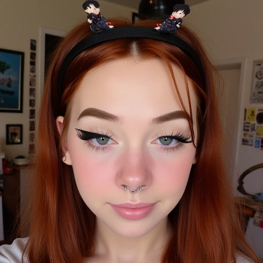 A selfie of a goth woman with long hair, , and black eyes, dressed in jeans and crop top. , goth Girl