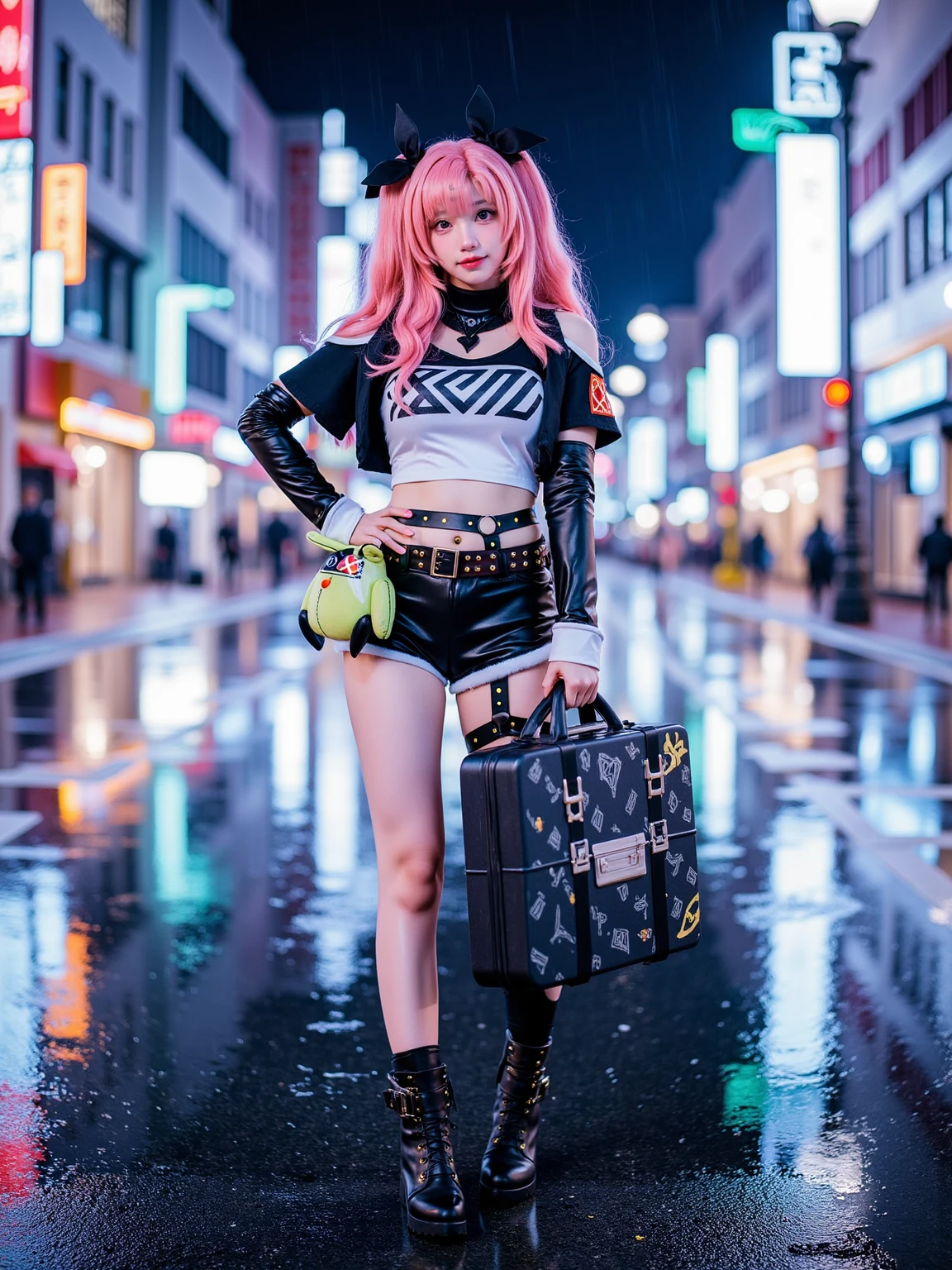 Set in a dazzling futuristic metropolis illuminated by vibrant neon hues, a striking figure strides confidently along a glowing pathway. Adorned in a futuristic ensemble, the individual wears a reflective metallic jacket accented with vivid pink, paired with sleek, shimmering pants that catch the pulsating city lights. Completing the look, the figure sports a black bralette and edgy high-top sneakers—a perfect fusion of bold design and cyberpunk aesthetic. Towering skyscrapers and holographic billboards populate the background, painting a vivid picture of technological sophistication. The scene captures the spirit of "Future Fashion," where cyber tailors revolutionize style to meet the demands of the year 3025—creating edgy streetwear that even neon cyborgs would envy!