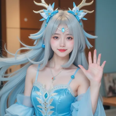 She wears a white hair accessory,With a butterfly decoration made of tulle,Smart and dreamy。 The ears are wearing delicate flower-shaped earrings,The long pendant adds elegance。A pearl necklace around her neck, In the middle is a light blue heart-shaped gem,Complements the overall shape。