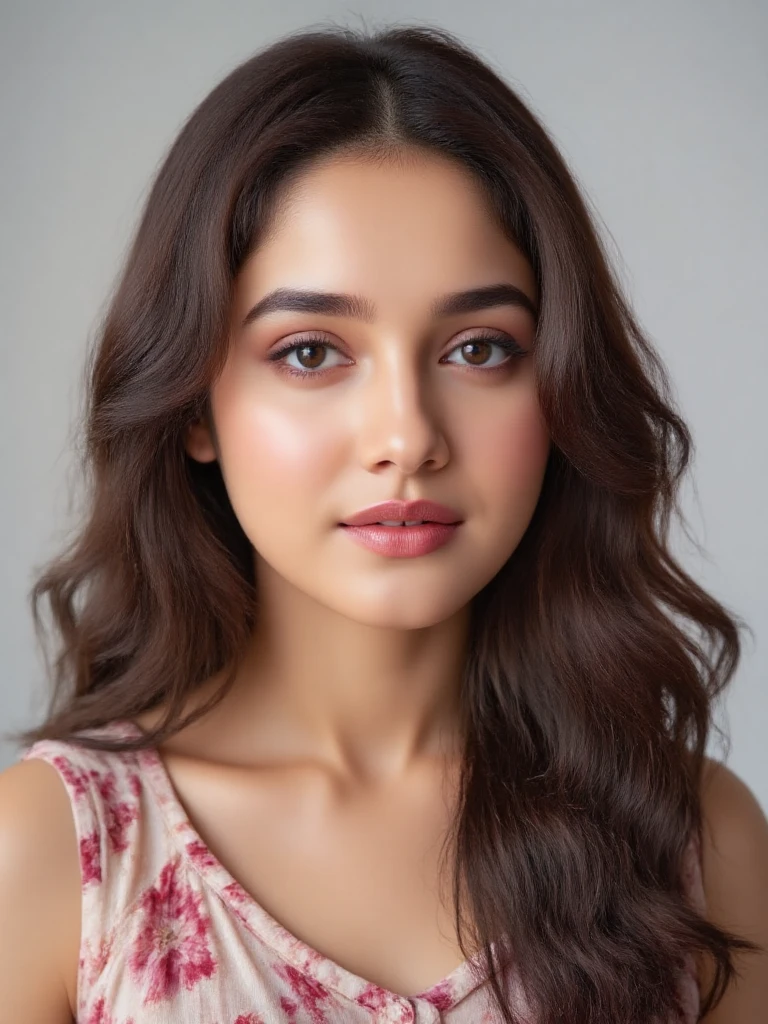 Her dark, long hair is parted in the middle and falls straight down on either side of her face, partially obscuring her shoulders. Her eyes are large and heavily emphasized with dark eyeliner and kajal, making them very prominent. She has a small, dark bindi between her eyebrows and a tiny nose ring on her left nostril.