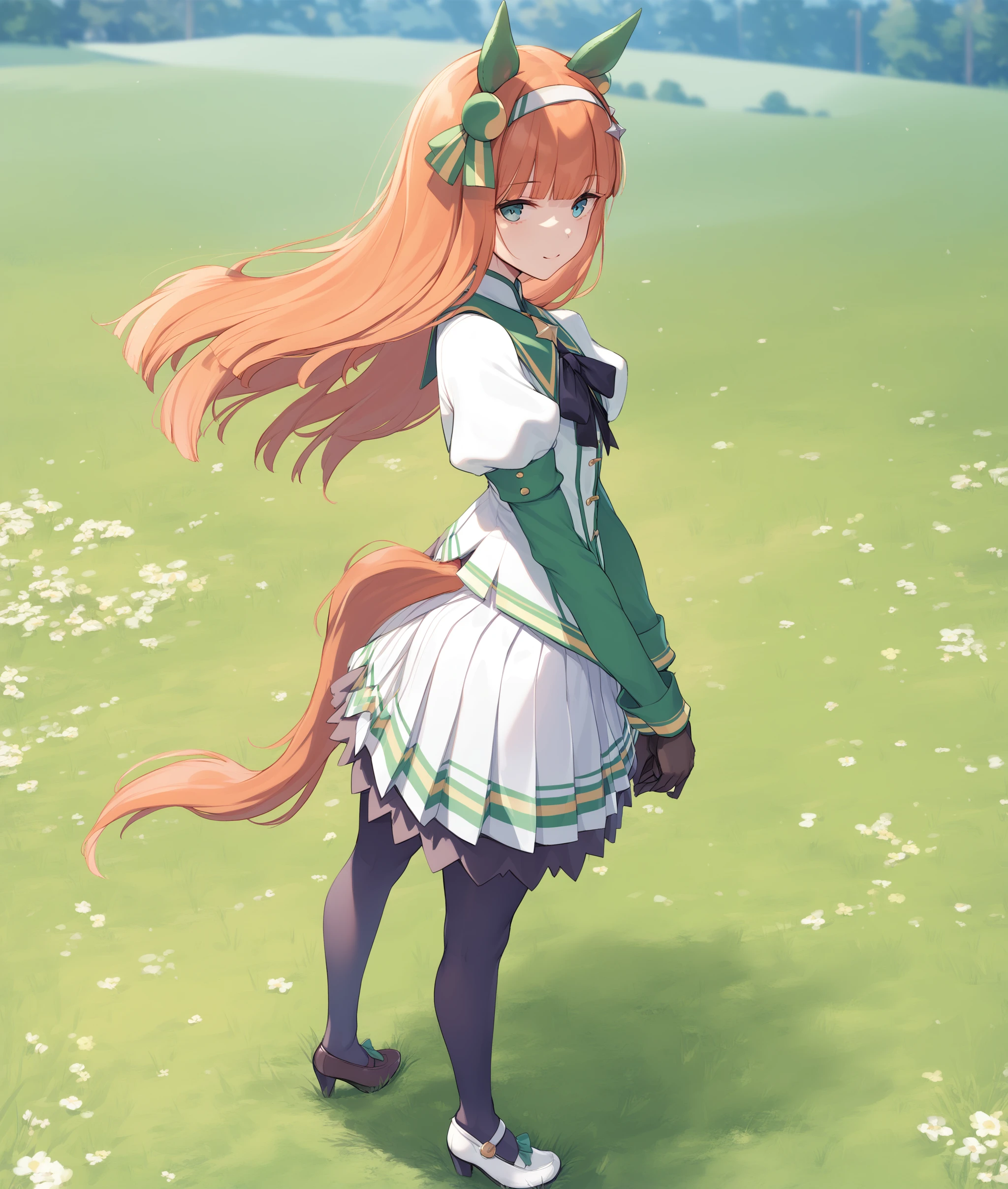 cinematic, (masterpiece), (best quality), (ultra-detailed), very aesthetic, illustration, realistic illustration, perfect composition, intricate details, absurdres, (anime, masterpiece, intricate:1.3), (best quality, hires textures, high detail:1.2), (4k),(incredibly detailed:1.4), 1 girl、 Silence Suzuka、Uma Musume、 long hair、 animal ears 、 ear covers、 white hair band、(( tea hair))、 horse tail、 green sailor color、 black ribbon、 white shirt、 layered sleeve 、Green Sleeves、 black gloves、 white skirt、 black pantyhose 、Outdoors、run、 full speed、Desperate、Flowing sweat、 running pose , full speed,in a dynamic motion,(from behind:1.2),(Don't look back, look ahead)