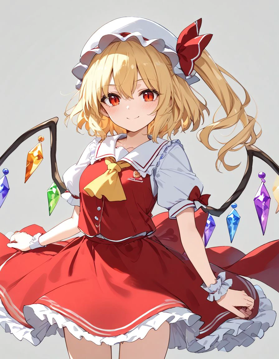 {{masterpiece, ultra-high quality, professionally detailed, professionally shaded}} single woman, Grown up, Tall woman, 22 year old, Flandre Scarlet, flanN, flandre scarlet, blonde hair, side ponytail, red eyes, hair bow, red bow, hair between eyes, slit pupils, white headwear, wings, crystal, crystal wings, slim waist, shoulder length hair, braid, small silver stud earrings, white puffy sleeves,white sleeves, short sleeves, red vest, yellow ascot, red skirt, frilled skirt, red miniskirt, frills,