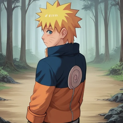 Naruto Uzumaki in a fierce and defiant stance, eyes glowing with determination, standing in the middle of a dark forest. The left half of his body is transforming into the Nine-Tailed Fox (Kurama), made entirely of flowing, fiery energy. The flames ripple with motion and emit a vivid orange-red light that illuminates the surrounding trees. His ninja outfit is partially torn by the transformation, and nine blazing tails rise and swirl behind him like liquid fire. Scattered leaves swirl through the air due to the force of his chakra. The atmosphere is intense and dramatic, with bold shadows and high contrast lighting. Highly detailed anime style, dynamic action lines, vibrant colors, cinematic composition, ultra-HD.