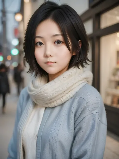 A Japanese woman in her 40s with short pixie-cut brown hair, wearing a thick winter coat and a scarf. Calm expression, looking directly at the camera. Natural skin texture, mature and realistic facial features. The background is a softly blurred winter urban scene. (((Fully clothed))) (((Realistic middle-aged face))) (((No excessive beautification))) (((Upper body chest-up portrait)))