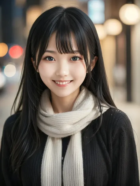 A Japanese high school girl with (((black pixie-cut hair))), wearing a (((navy turtleneck sweater))) and a (((red scarf))). Looking directly at the camera with a calm, natural expression. Youthful skin and realistic facial features. Chest-up portrait from the front. The background is a softly blurred classroom or school exterior. (((Fully clothed))) (((Age-appropriate natural face))) (((No excessive beautification))) (((Clean and warm winter clothing)))