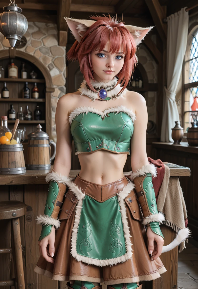 Neko Bar, cute, neko, oriental, bar, girls, chinese, orginal, tight clothing, torn clothes, thigh straps, bruised body, bloody wounds, tired face, dark angry eyes. The level of detail is inspiring, with intricate elements meticulously crafted, volumetric effects adding depth and dimension, and the photorealism is unmatched. The image is rendered in 8K resolution, ensuring ultra-detailed images. Volumetric rays add a touch of magic, highlighting their beauty and aura in a supernatural way. High dynamic range (HDR-10) technology makes the nuclei stand out, adding richness to the overall composition. MarinBraveSoul, red hair, blue eyes, cat ears, cat tail, green leather armor, brown furtrim boots, crop top, furtrim chocker, short furtrim skirt, brown skirt, shoulders, ruanyi0649, w1tch