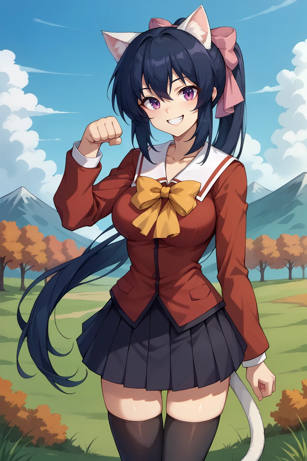 school uniform, sailor collar, red jacket, yellow bow, pleated skirt, black thighhighs,cat ears, cat tail,hmrnhr, black hair, purple eyes, very long hair, ponytail, hair bow,,ONES,748cmstyle, 1girl in pose action, fine trait, anime style quality, digital drawing mode, pose dynamic,a ninja-girl in style Genshin Impact, big , very long wavy Bluehair, well drawn fierce green eyes, cinematic lighting, intricate uniform detailing, very detailed background,in the night Japan temple,moon,clouds.