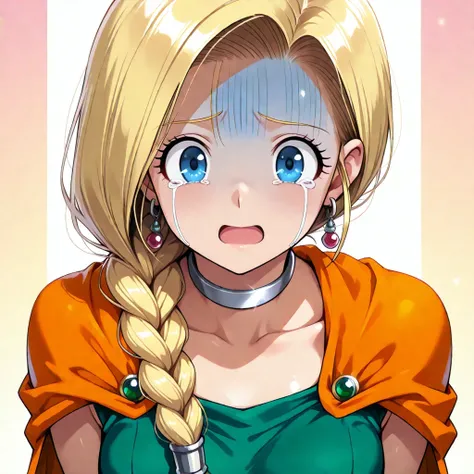 (ultra detailed),Upper Body Up、Smile、Indoor、bianca \(Dragon Quest,Blonde Hair,braided ponytail,one line braid,hair ornament,hair on shoulders with Scrunchie,hair ornament,Blue Eyes,Lashes,gem,gem,ear piercing,Cross Earrings,bracelet to enter the ocean,silver choker,Orange Cape,green dress,off sleeve ,Dress with sleeves,Long Cape,belt buckle, green legwear,boots,Green Skirt,long skirt,(masterpiece),(best quality),hi-res,Anime,shiny skin,