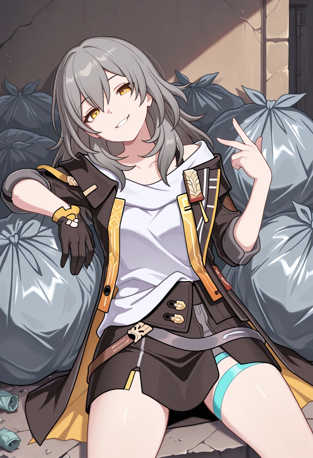 大人の女性,long blonde hair,gray coveralls, durty workwear,boots,wariza,face focus,all fours,open clothes,from below:1.4,trash bag,汚れている