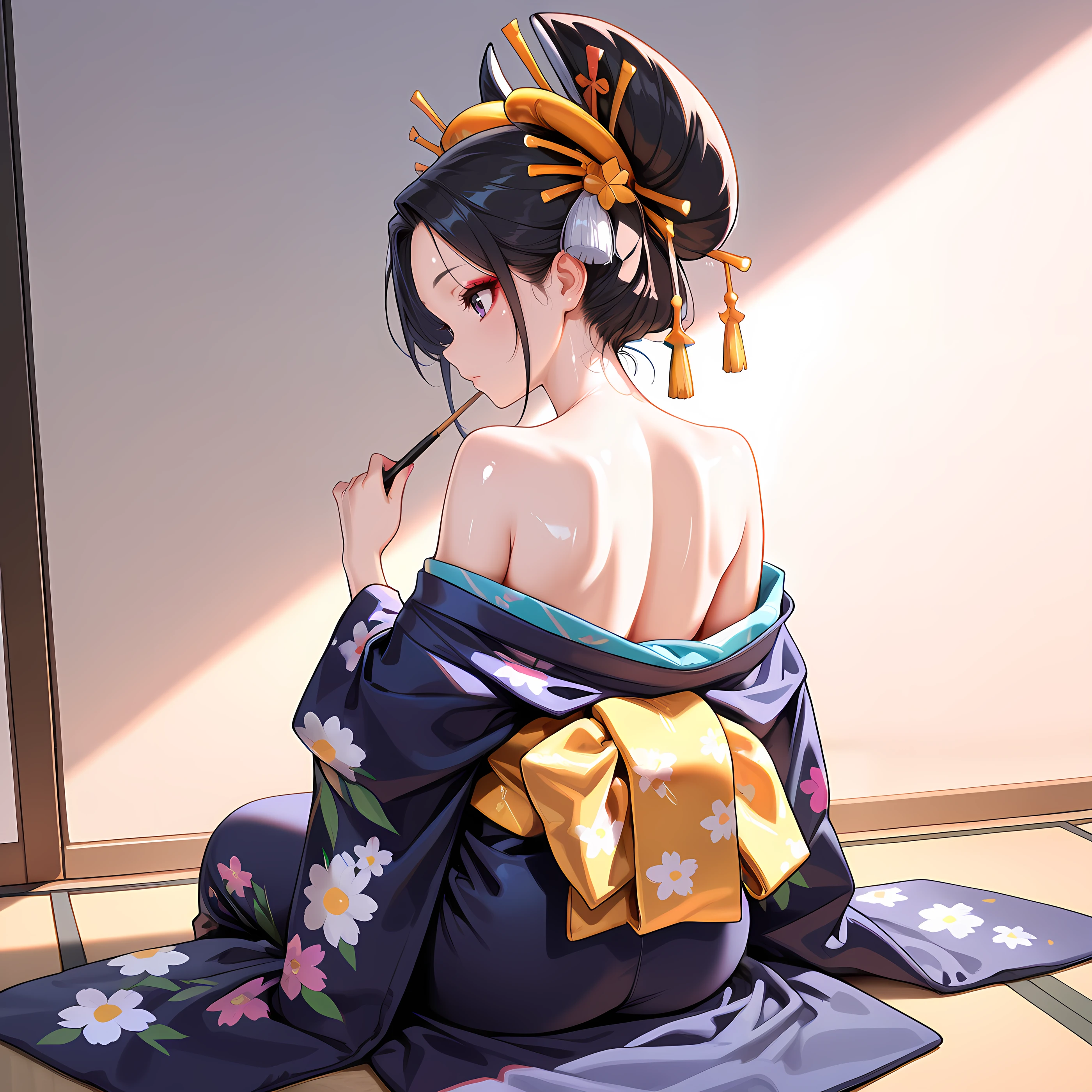 **Clothing/Accessories:** *Traditional Japanese kimono (casual, private-space looseness).*