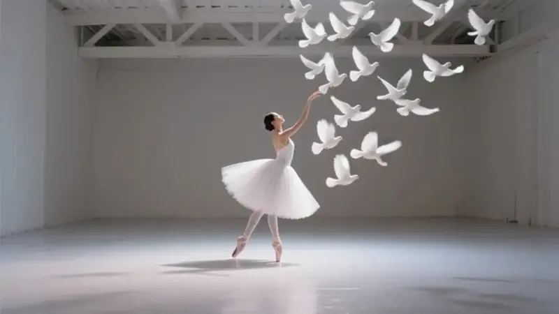 Prompt: "A graceful ballet dancer in a pristine white tutu and pointe shoes performs a fluid pirouette in the center of a minimalist, softly lit stage. As she spins, she seamlessly transforms into a flock of fluttering white doves that ascend towards the rafters. Smooth, orbiting camera movement circling the dancer and following the doves' ascent, ethereal and magical lighting."