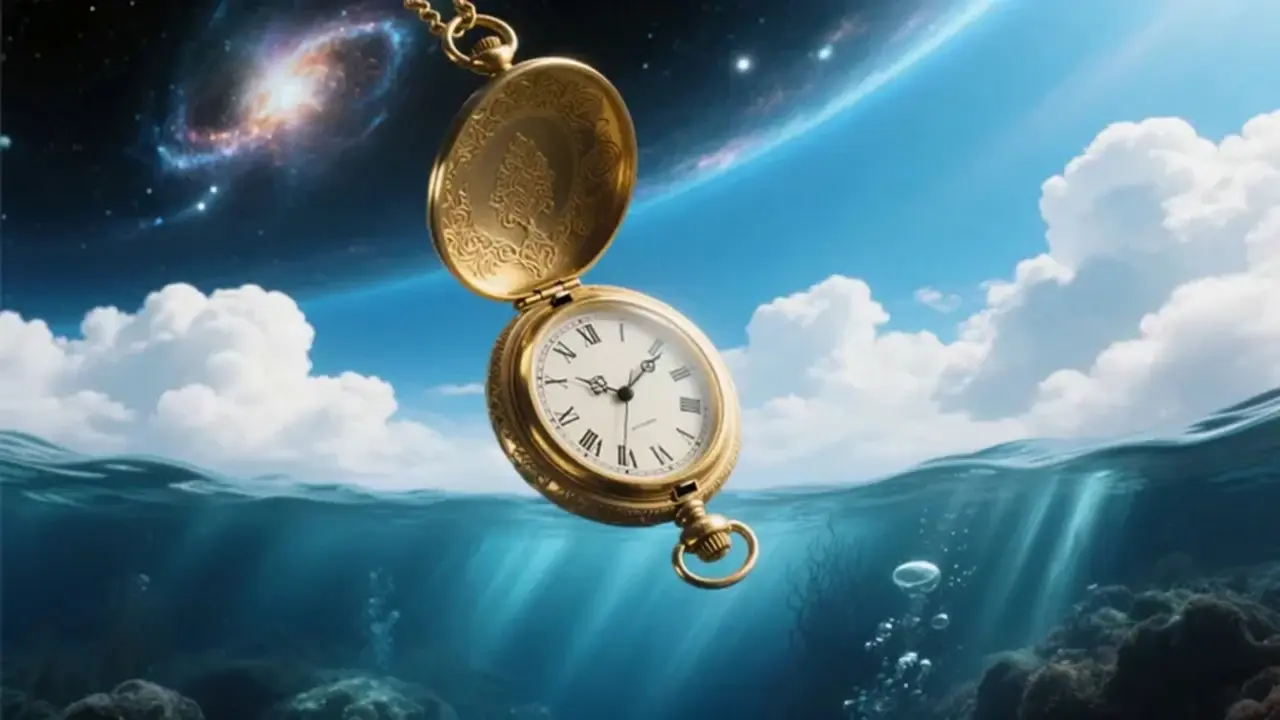Prompt: "A golden Victorian pocket watch, intricately engraved, falling slowly through different environments – starting in the vacuum of space with distant nebulae, then plunging into a deep, murky underwater realm with shafts of light, finally drifting gently through fluffy white clouds against a blue sky. Tracking shot closely following the watch's descent, dramatic and contrasting lighting for each environment."