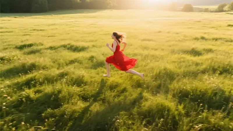 Example: "A young woman wearing a flowing red dress, sprinting joyfully across a sunlit meadow. Wide aerial shot, camera smoothly tracking her movement from above."