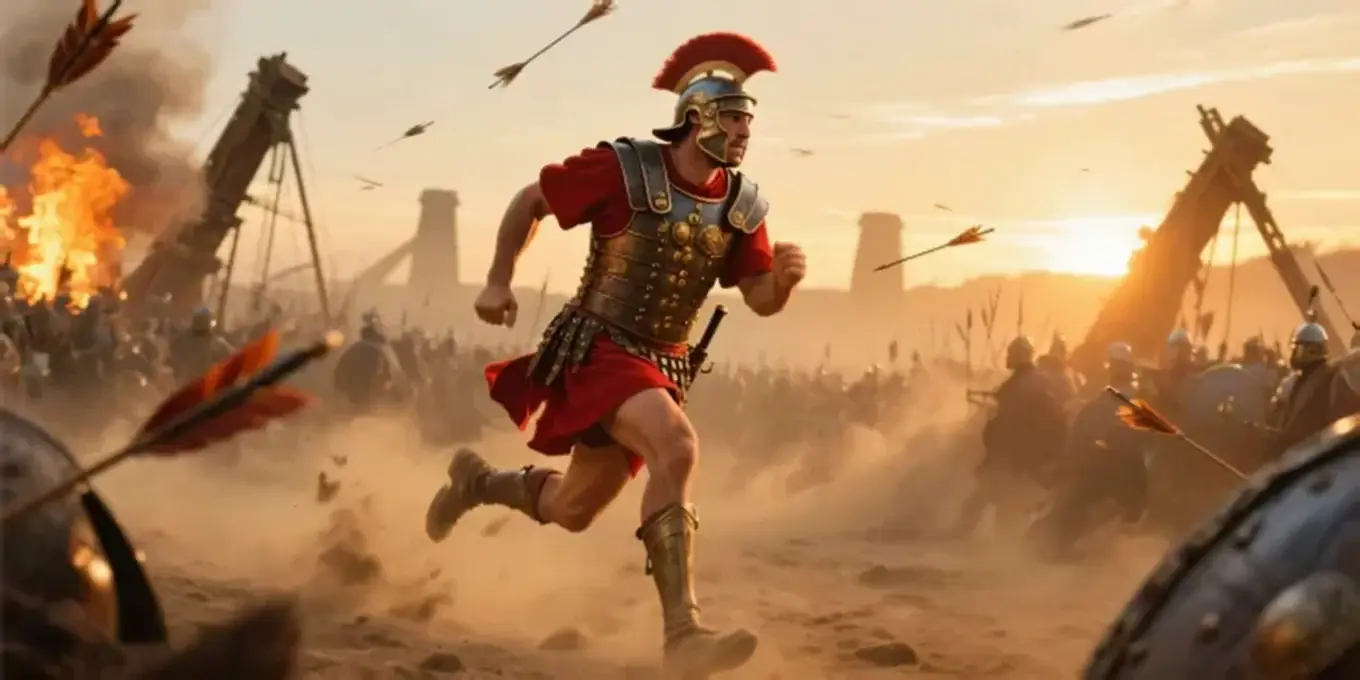 Prompt: "A Roman legionary, clad in detailed segmentata armor and a red tunic, sprints through the chaotic frenzy of a large-scale battle at sunrise. Dust and smoke fill the air, with distant catapults firing and arrows flying. Tracking shot closely following the soldier from a slightly low angle as they navigate the battlefield, dramatic golden hour lighting mixed with the orange glow of fires, epic and gritty atmosphere."
