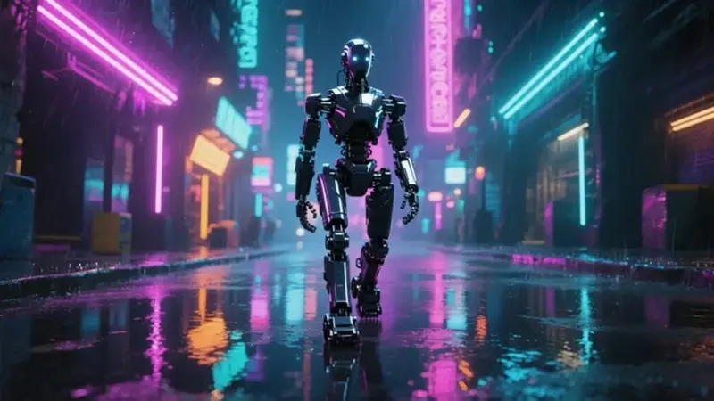 Prompt 1: "A sleek futuristic robot, chrome and black, standing tall and alert, marching through a rain-soaked neon city street at midnight. Reflections shimmer on the wet pavement and on the robot's chassis. Low-angle tracking shot, vibrant multicolored neon lighting casting long, distorted reflections, moody and gritty cyberpunk atmosphere."