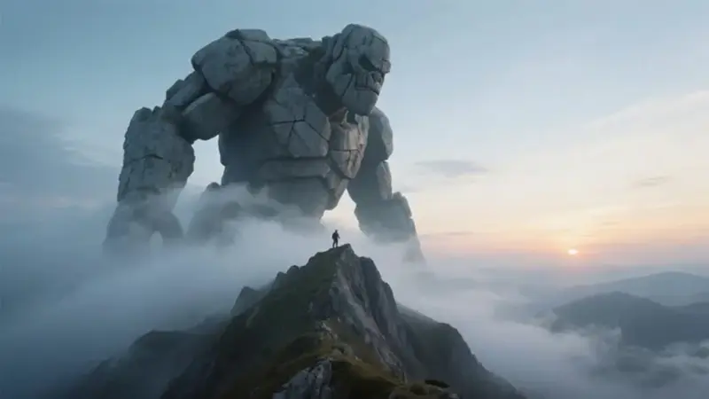 Prompt 2: "A towering stone golem, ancient and weathered, slowly awakening atop a misty mountain peak at dawn. Swirling clouds obscure the base of the peak. Low upward tilt shot emphasizing its colossal size, soft cool-toned pre-dawn light transitioning to the warm glow of sunrise, epic and awe-inspiring atmosphere."