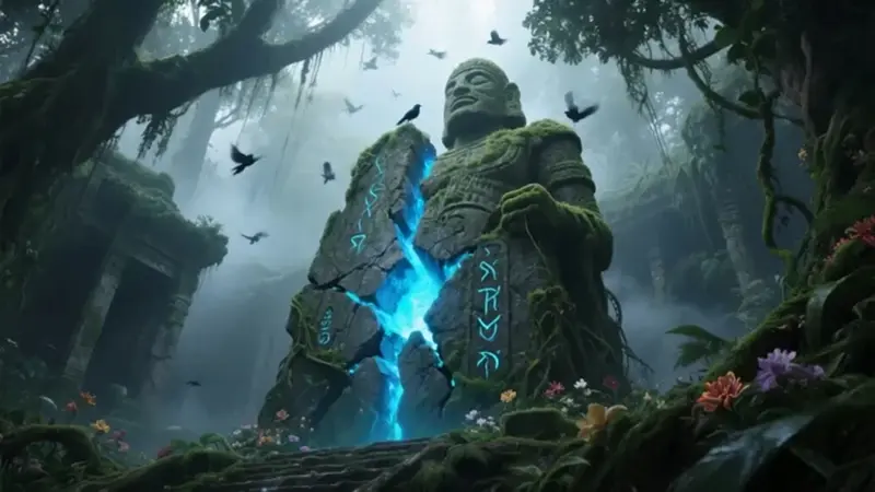 Prompt: "An ancient, moss-covered stone idol, with faintly glowing runes etched into its surface, slowly cracks open to reveal a pulsating, ethereal blue core. Hidden deep within a dense, fog-laden jungle temple overgrown with thick vines and exotic flowers. Birds and unseen creatures scatter from the dense canopy above as the idol activates. Low upward camera angle emphasizing the idol's scale, shafts of eerie blue light emanating from the core mixed with misty sunlight filtering through the jungle, mysterious and powerful atmosphere."
