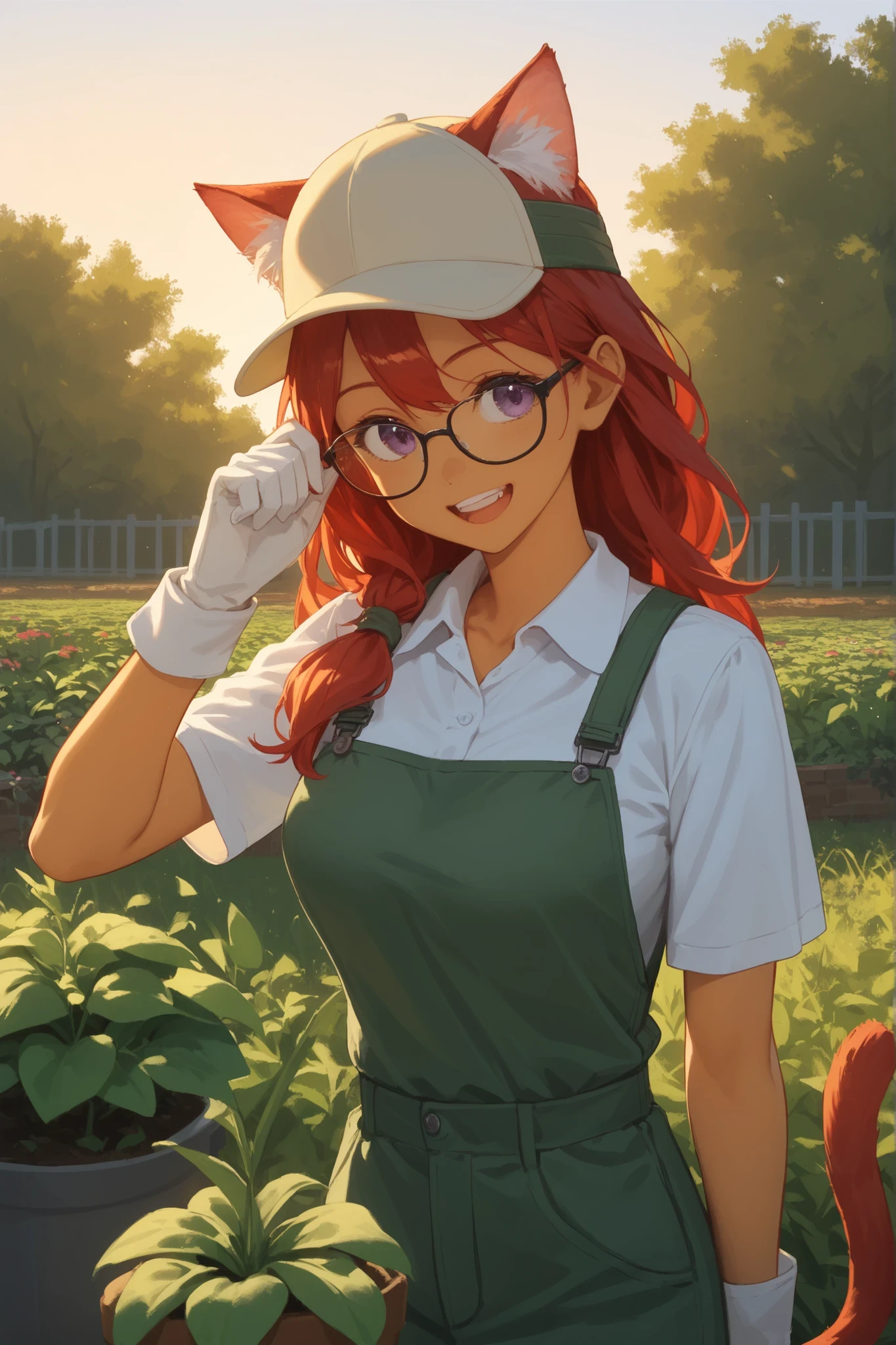 "score_9, score_8_up, score_7_up, working, olive skin, rating_safe, source_cartoon, 1girl, cat ears, cat tail, red hair, long hair, purple eyes, young adult, athletic, ?, gardening clothes, glasses, hat, gloves, upper body, laughing, outdoors, sunset, masterpiece, best quality"