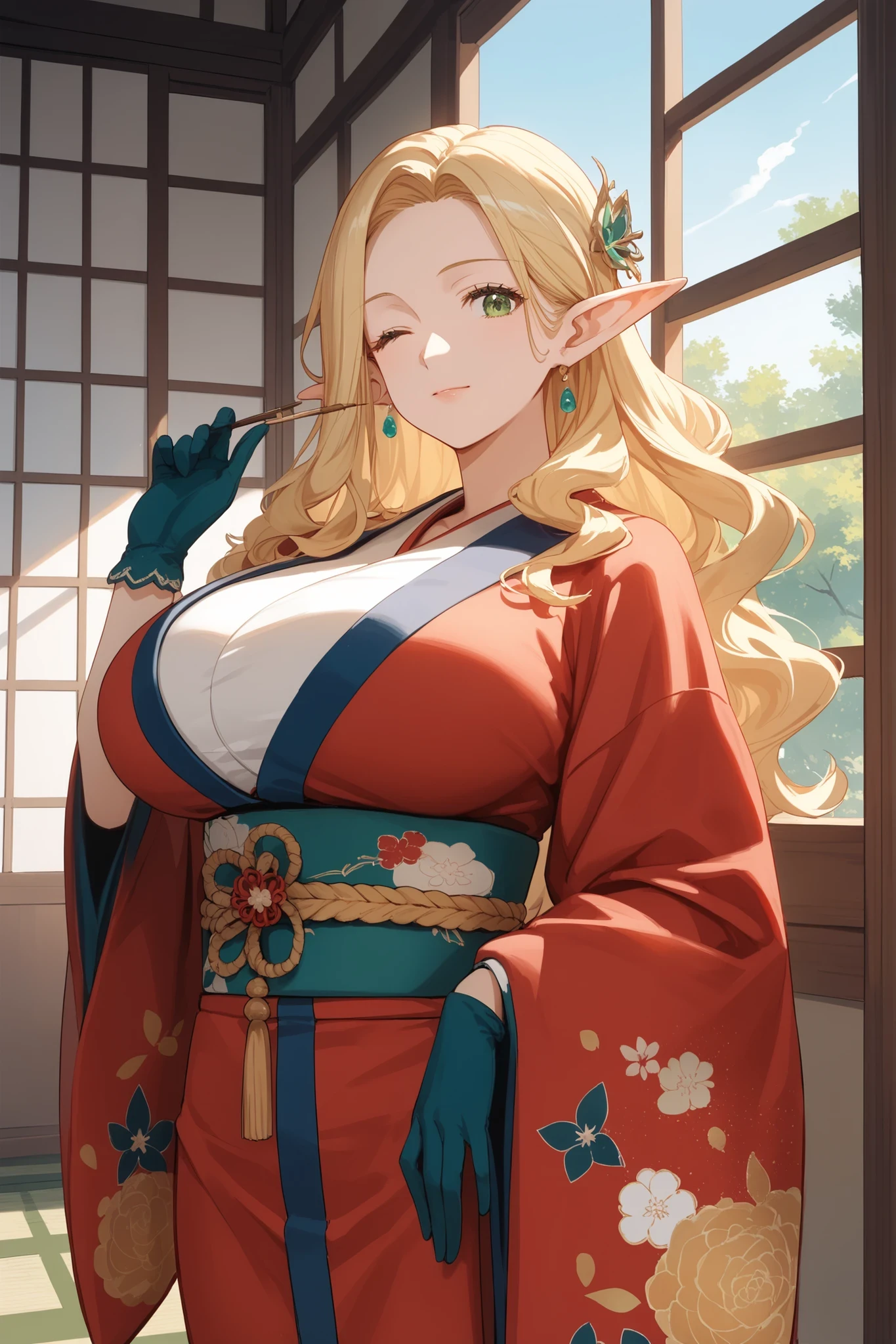 "score_9, score_8_up, score_7_up, looking out window, pale skin, rating_safe, source_anime, 1girl, elf ears, blonde hair, wavy hair, green eyes, mature, curvy, ?, kimono, gloves, looking at viewer, winking, indoors, day, masterpiece, best quality"
