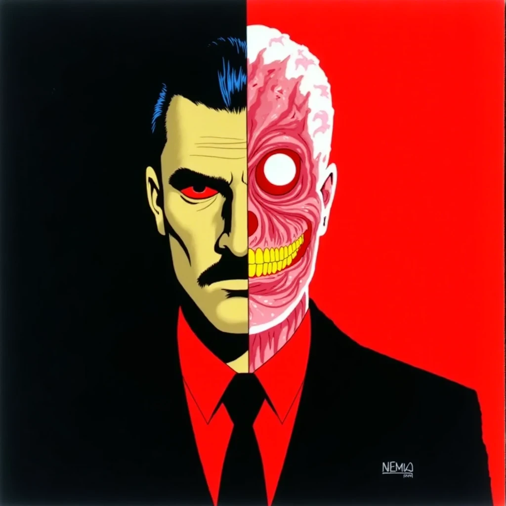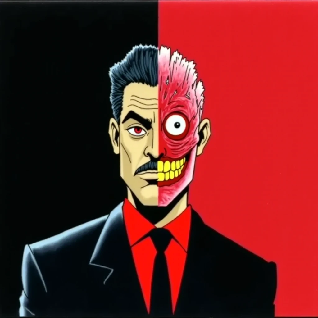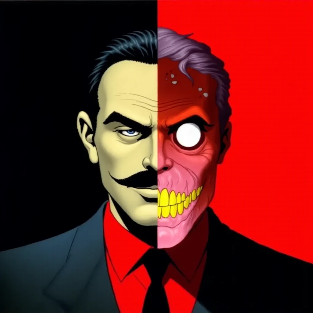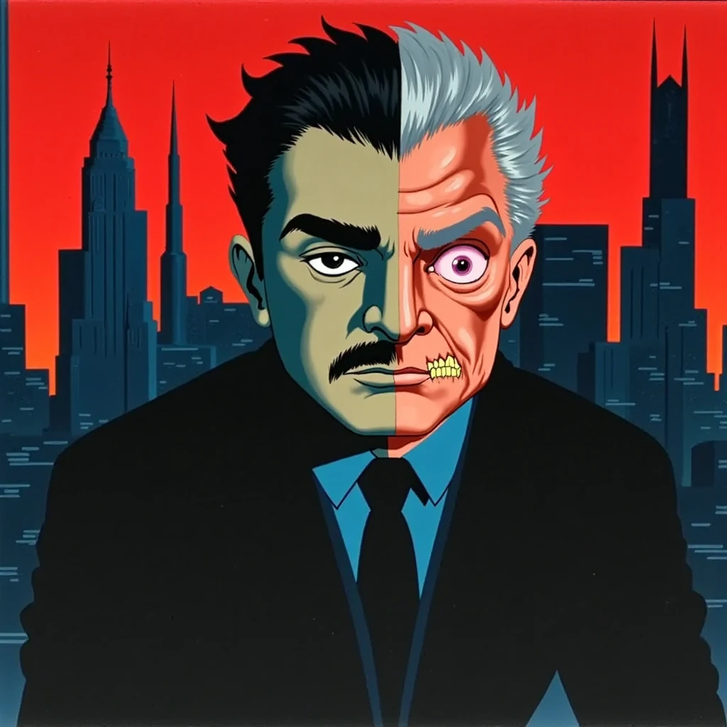 Using the prompt "dual identity , split , conflicting , juxtaposed , transcendental , splash page , comic , hand drawn , ink lines , cel shaded , animation , cartoon , charcoal , watercolor" yielded these results with Flux. While similar to the source image, it lacked the Gotham skyline wanted for this image submission for the daily challenge.