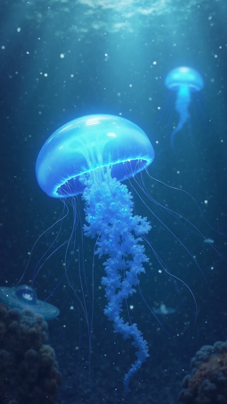 A glowing jellyfish slowly swimming in the deep sea, blue bioluminescence, dreamy atmosphere, wide-angle lens, cinematic quality, 2K