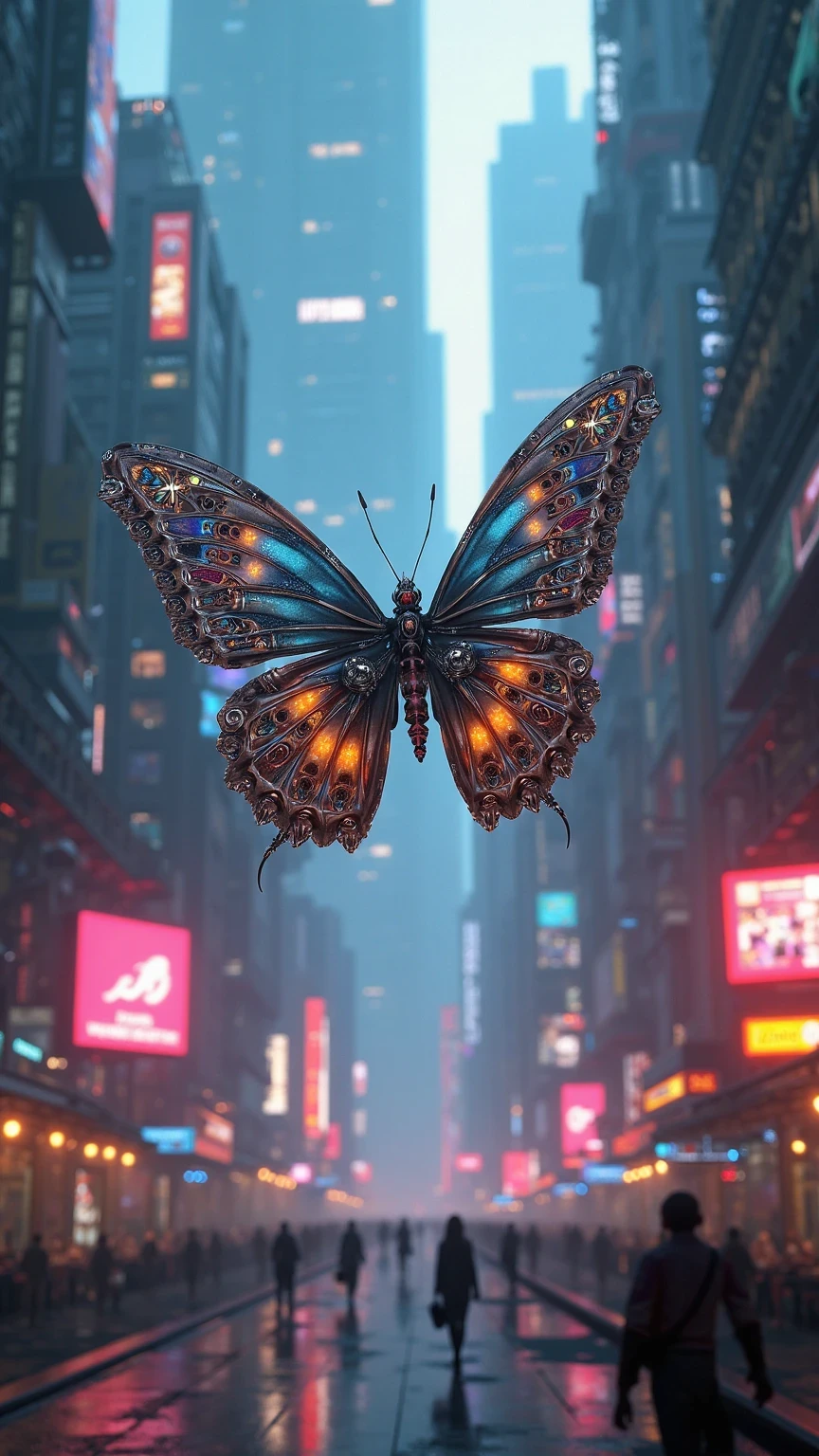 A mechanical butterfly flying in a neon city, cyberpunk style, medium telephoto lens, 2K