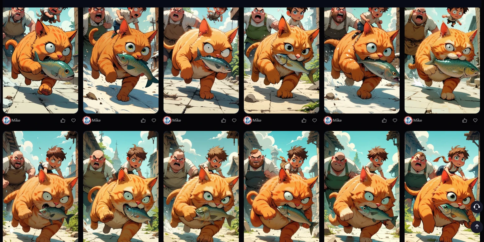 These are only a selection of images that I saved, there were a lot more that had obvious flaws that I didn't even consider for my comic. It was unbelievably hard to get exactly what I want. In this panel, the cat runs away from a fish seller after stealing a fish. I wanted the cat to look cute, with a small boy on its head. It took many tries before I got this perfect composition, but the details are not perfect. So, I use Img2Img countless times in order to get what I want.