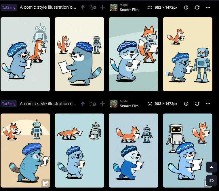 Anyway, I dread having to generate comic panels with very specific actions for multiple characters within the scene. Let me give you an example panel I need for one of my comics. I wanted to create a panel where an otter walks away from the robot while a fox walks towards the robot. Simple, right? But it is stupid hard to get it right through image generation. Just look at what it generated for me below.