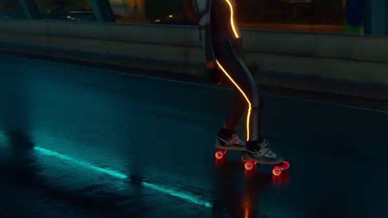 Low-angle following shot,A skater in a glowing roller suit glides fast on a wet city street after the rain,lens close to the wheel,with sparks and reflective tracks behind;
