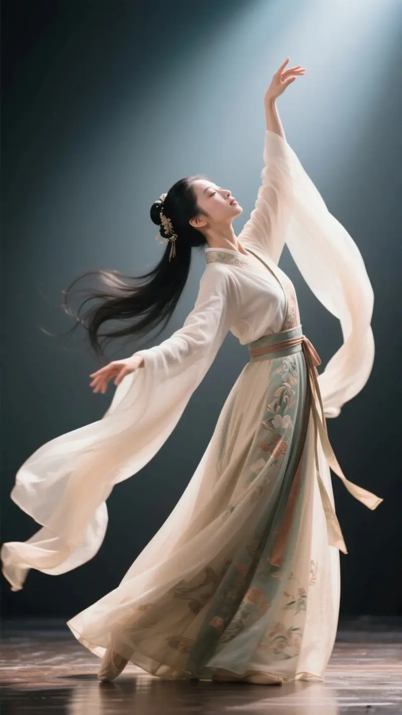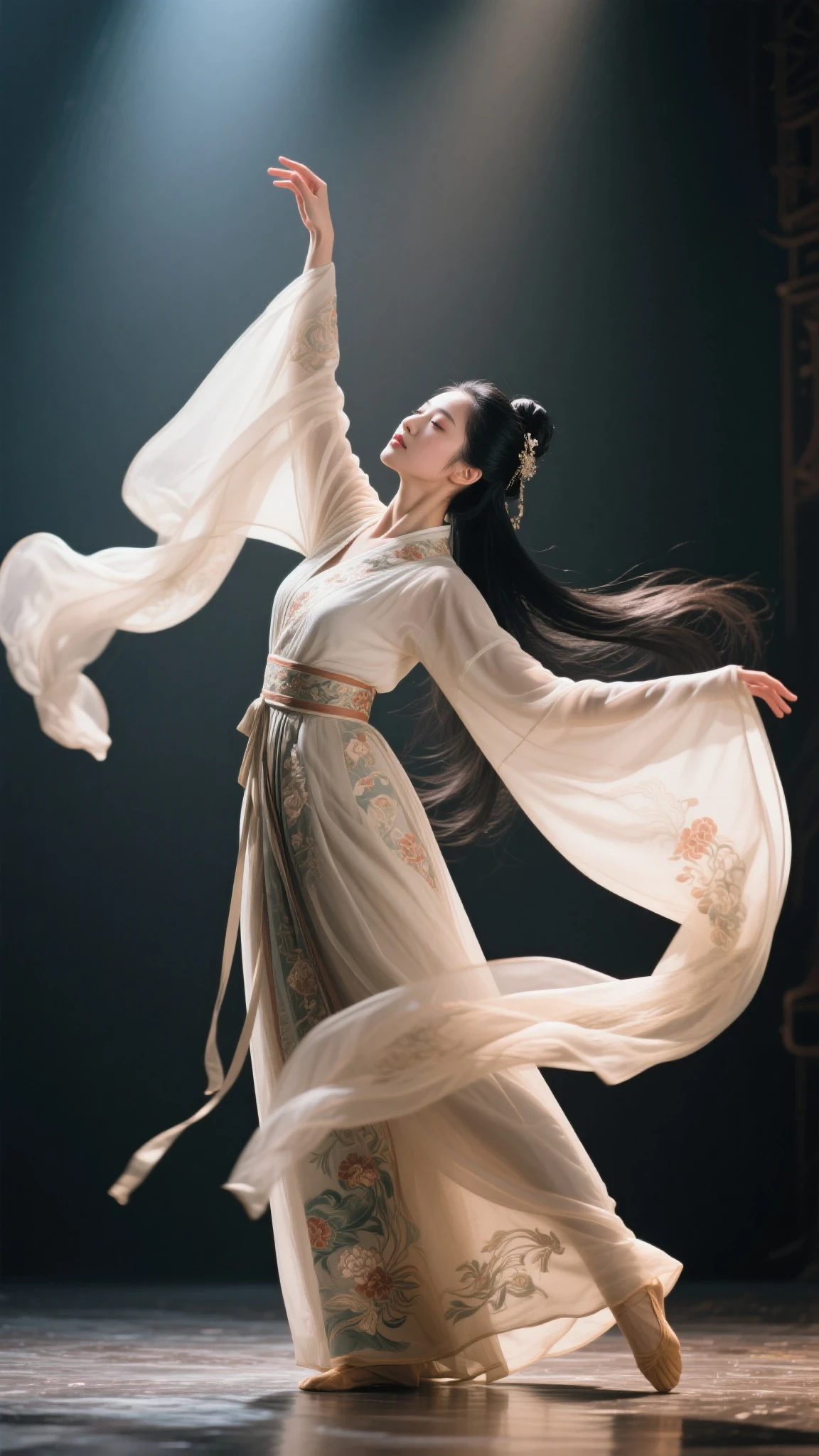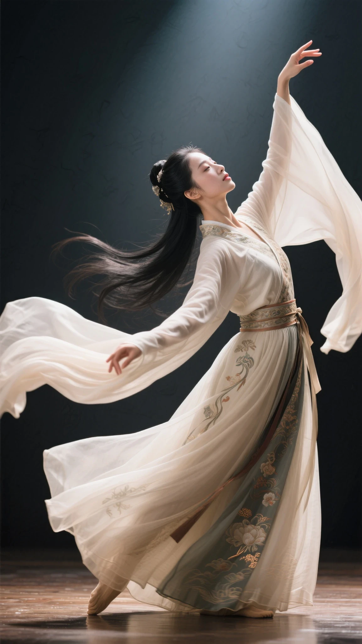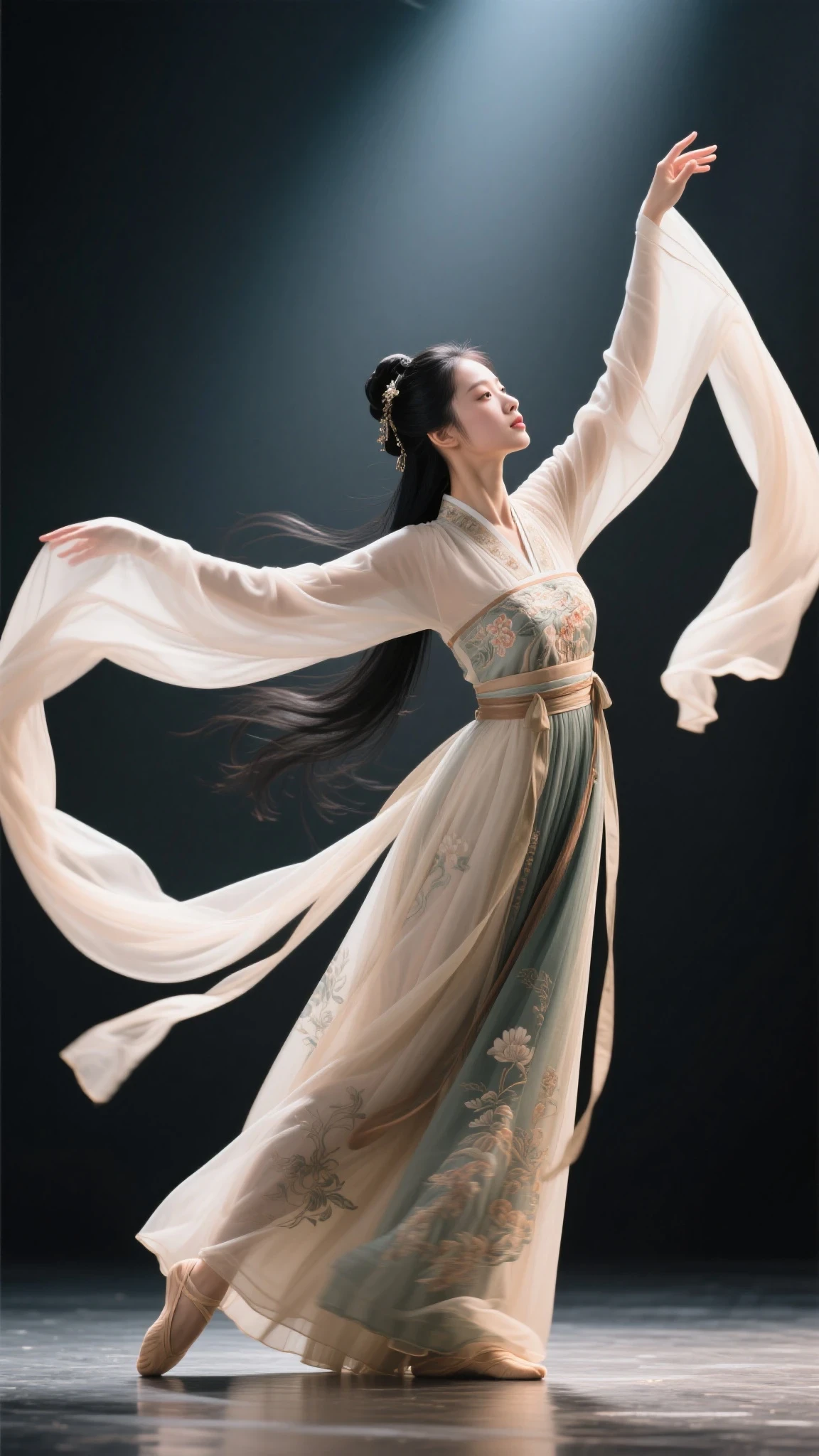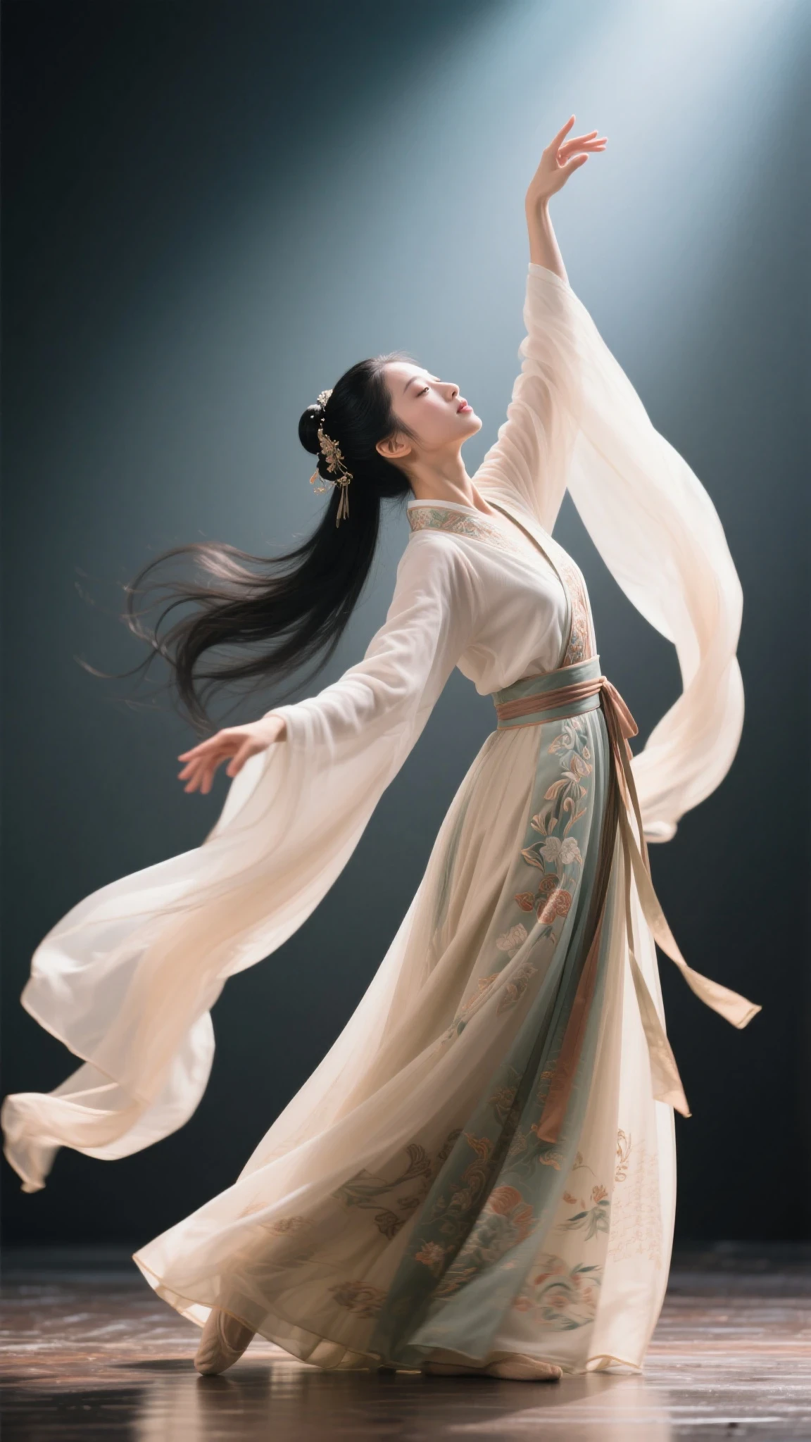 一位身穿飘逸汉服的古典女子在聚光灯下优雅起舞,动作流畅、服饰飞扬,氛围柔美、古典唯美。