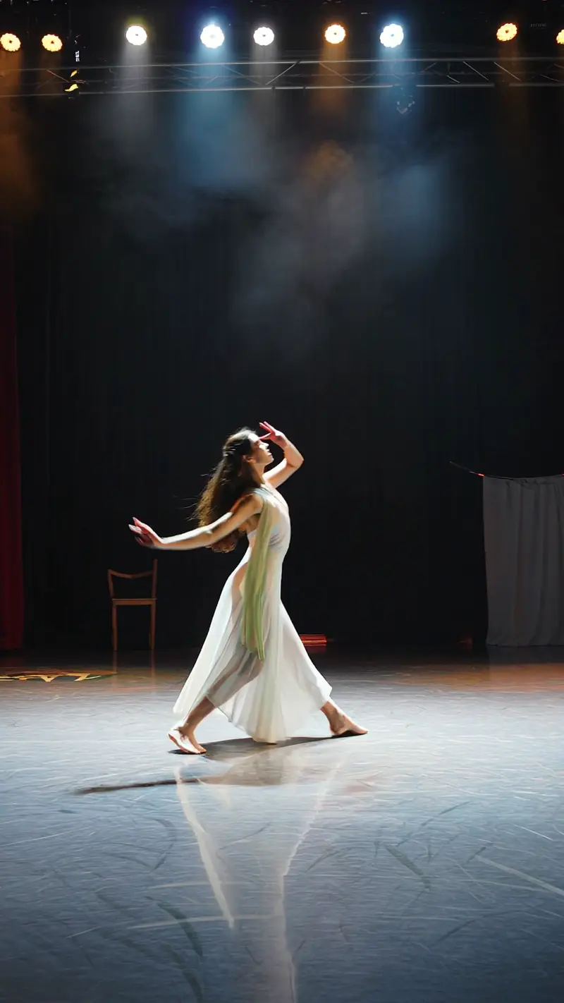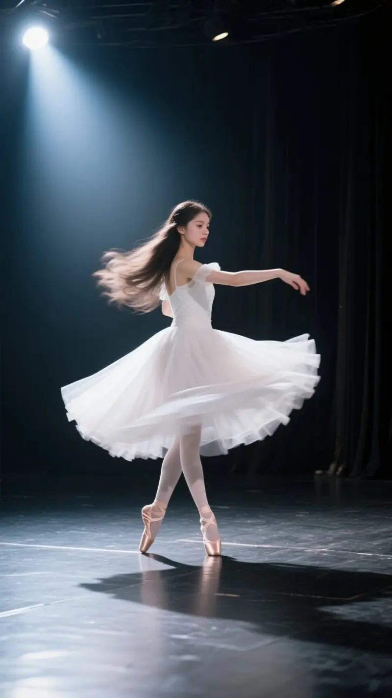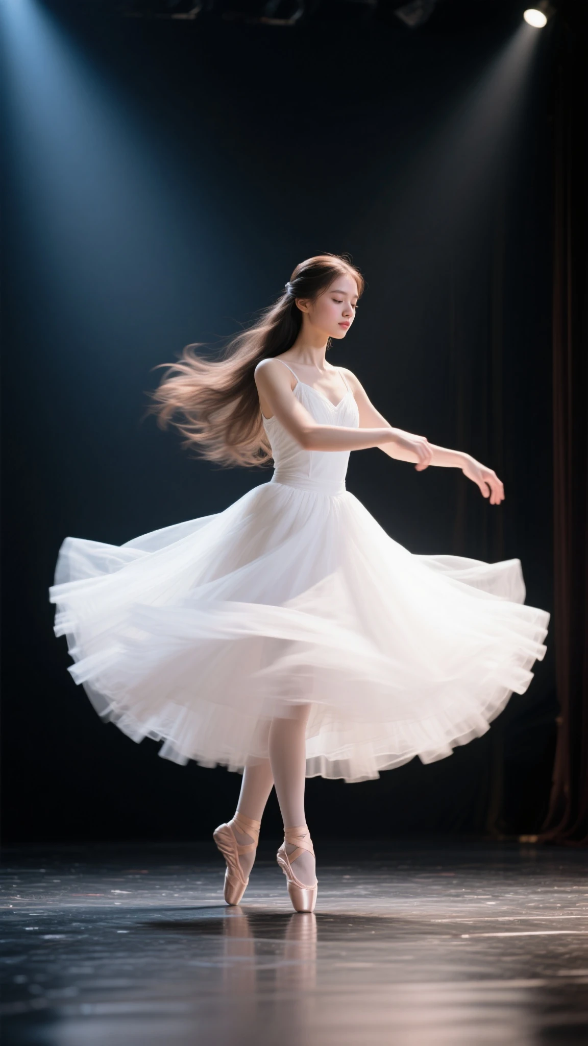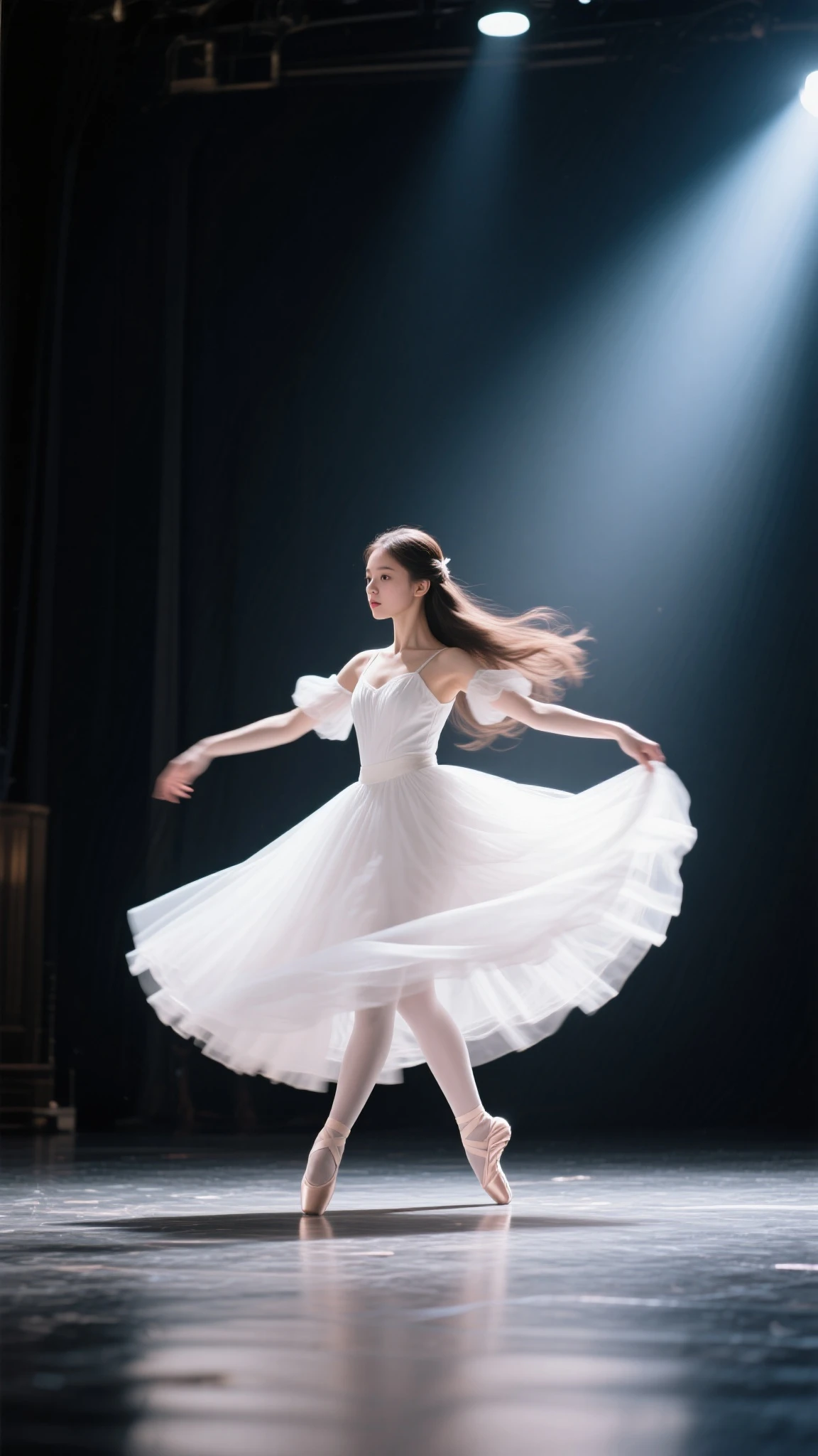🎯 场景设定:一位少女独自在剧场中央跳舞,背景暗场聚光,裙摆飞扬,镜头捕捉她轻盈转身与坚定眼神,富有剧情张力。