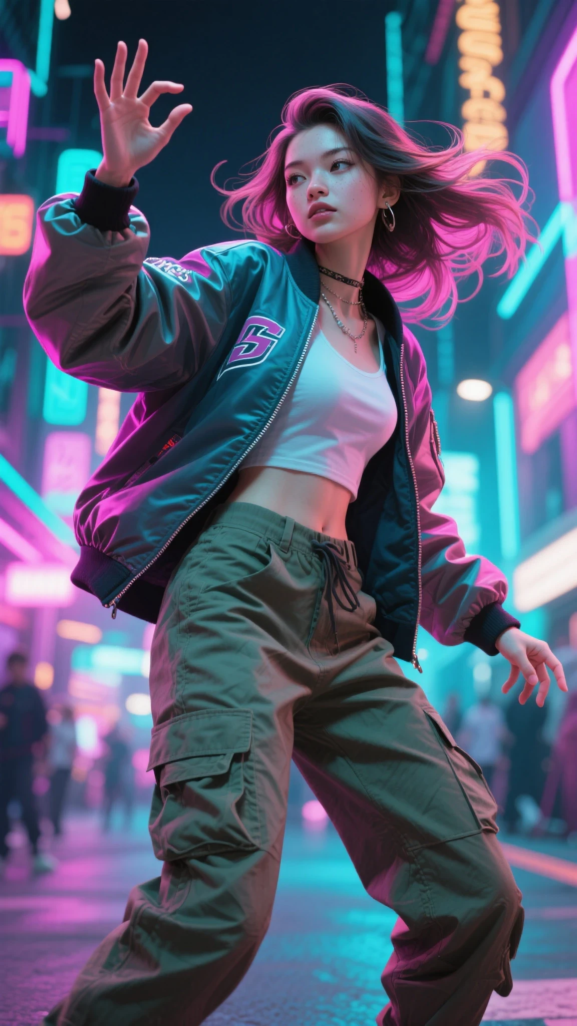 🎯 场景设定:女孩穿着潮流街舞服饰,在城市霓虹街道跳locking,节奏快、姿态酷