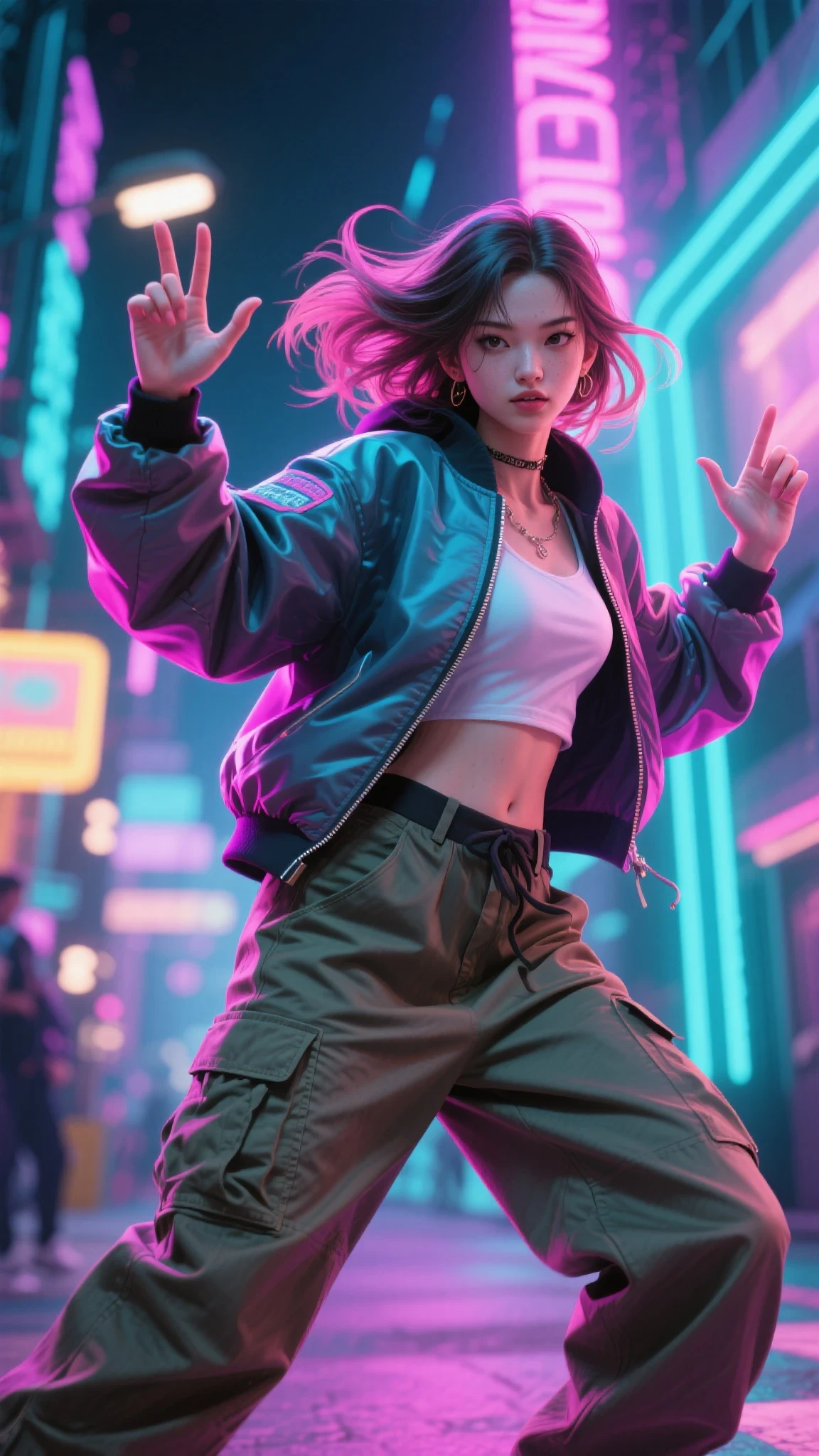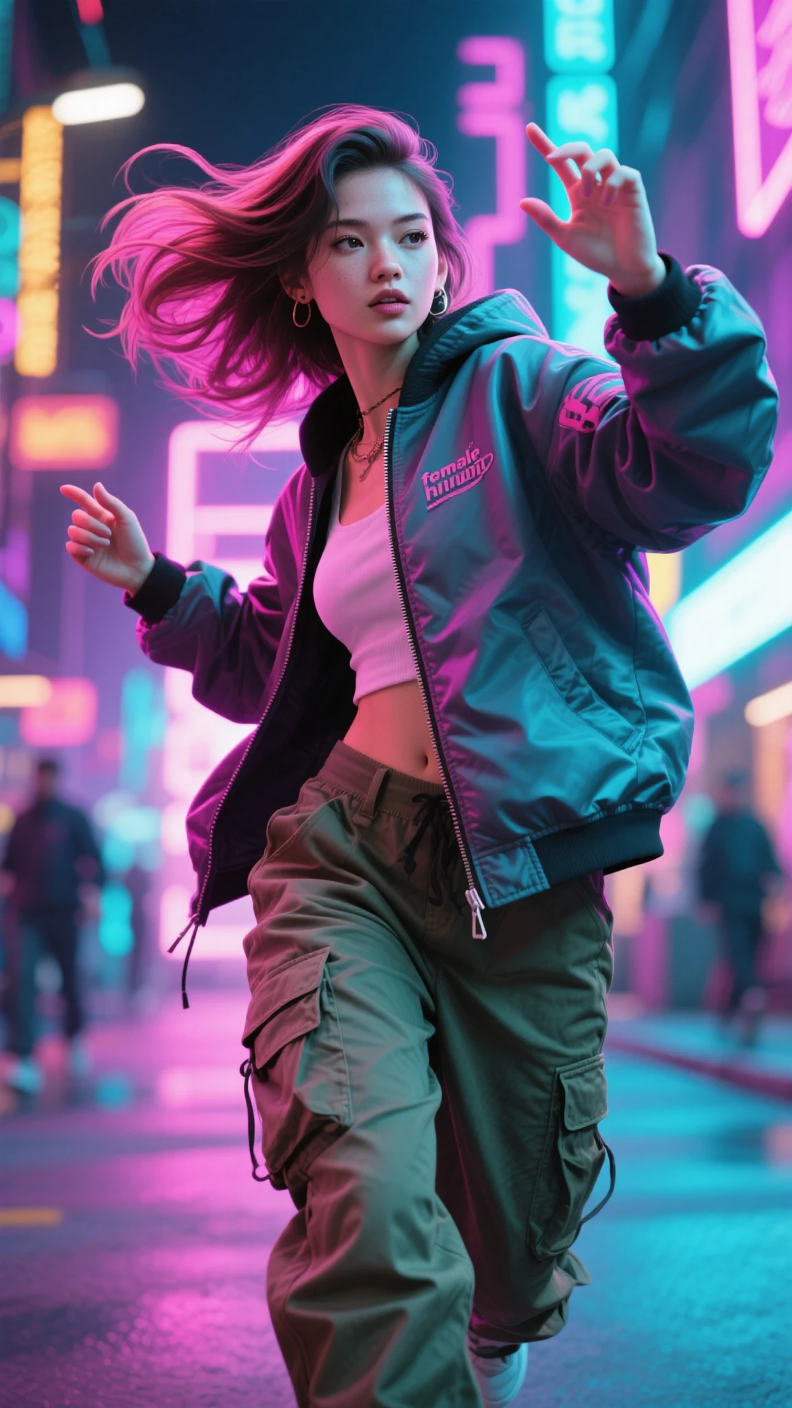 “female hip-hop dancer in oversized jacket and cargo pants, dancing on neon street, expressive arms and quick body movements, close-up shots of hand gestures, hair bouncing, colorful lighting, fast-paced urban mood, ultra realistic animation, film video style”