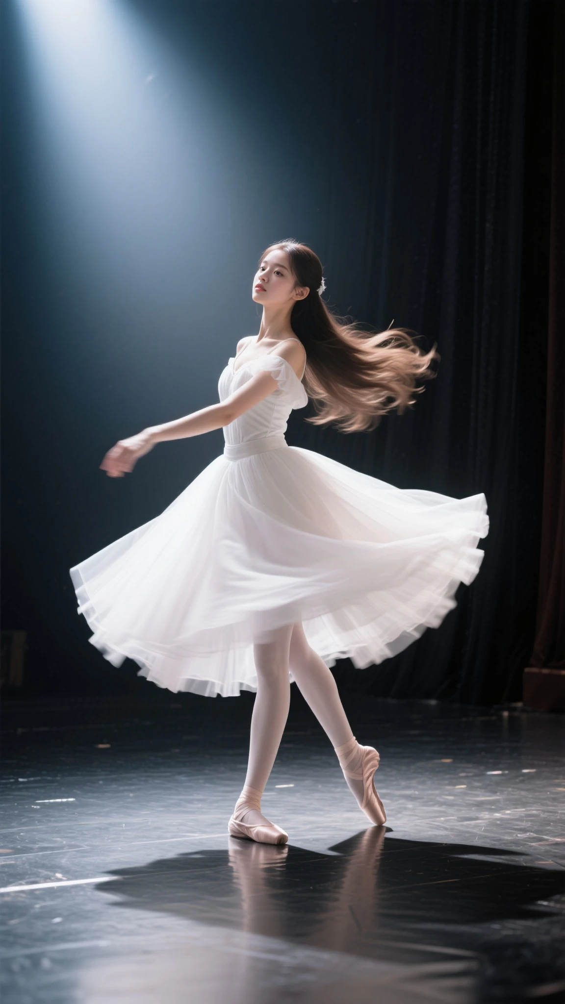 "A beautiful girl dancing alone on a dark theater stage, the white ballet dress spinning as she spins, the spotlight following her movement, emotional eyes, soft features, long hair that moves as she spins, cinematic lighting, super detail"