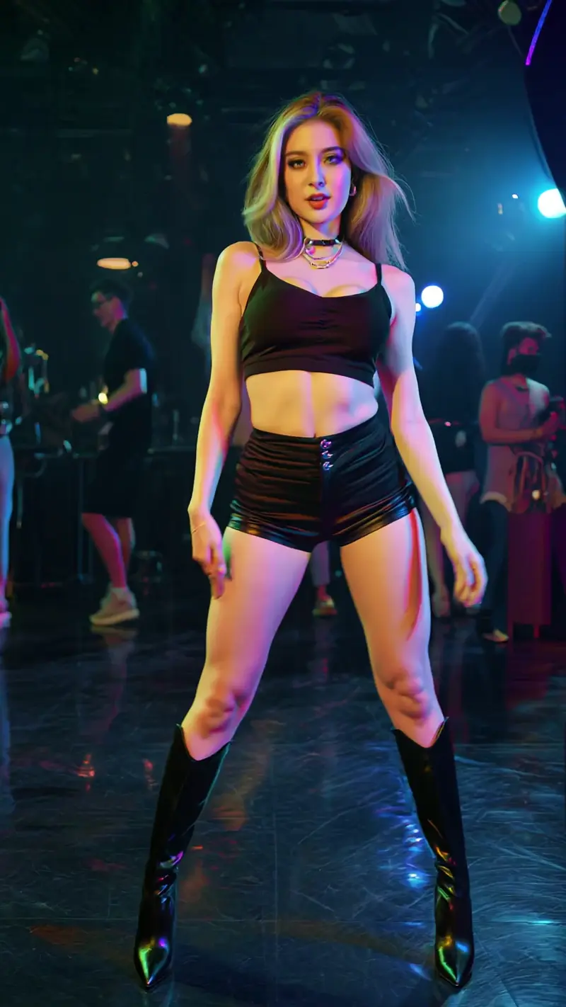 A ? Western woman with long legs and a curvy body, wearing K-pop girl group style outfit (crop top, high-waisted shorts, thigh-high boots), dancing a trendy TikTok dance in a vibrant nightclub scene.