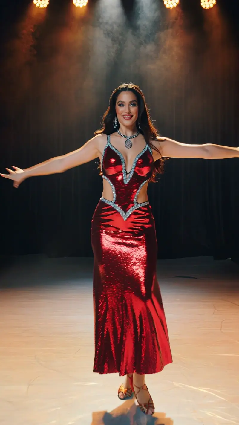🎯 场景设定:身穿红色亮片裙的女舞者,进行拉丁扭胯旋转动作,伴随特写与步伐运镜
