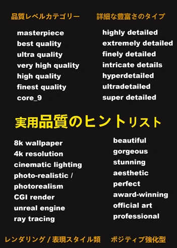 よく使われる汎用品質プロンプト: masterpiece, best quality, ultra-detailed / highly detailed, realistic / photorealistic, etc.