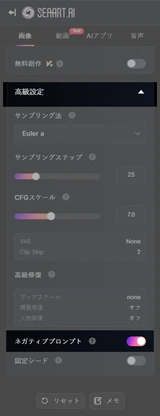 高級設定を開き、ネガティブプロンプトにチェックを入れる