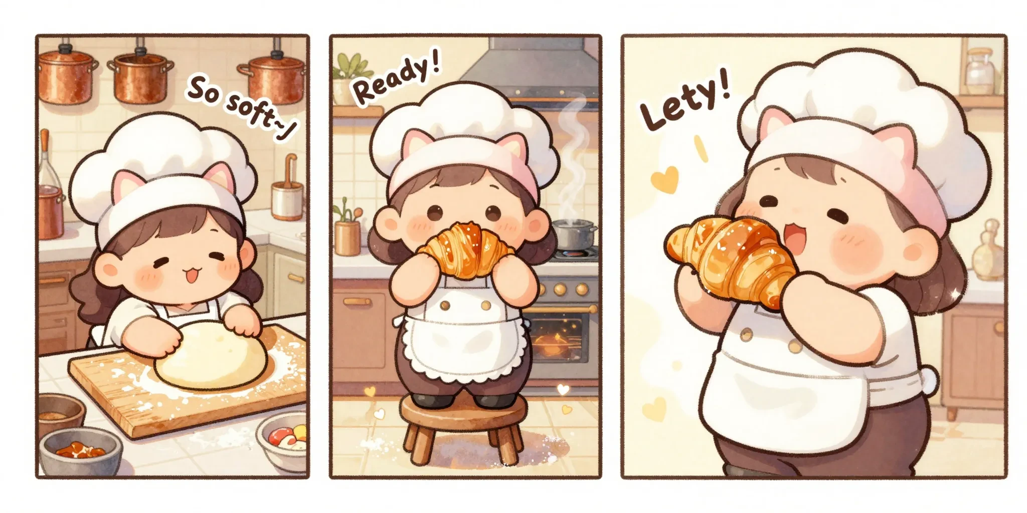 The comic book layout features three equal panels side-by-side. It depicts a chubby, chibi-style little cook with fluffy cream-colored curls, a pink cat-ear headband, and a white apron with lace trim, in a coZy, sunlit kitchen.Left panel: She's sprawled on a giant kneading mat, her cheek rubbing against the soft dough, looking blissfully content. The caption reads "So soft~♪," and the background shows a beige wall covered in copper pots.Middle panel: Standing on a small stool, she holds aloft a freshly baked caramel-colored croissant, her eyes sparkling. The caption reads "Ready!", and behind her is a warm-glowing oven with rising steam.Right panel: She's about to take a bite, her mouth agape in blissful happiness, a satisfied blush on her face. The caption reads "Let's eat!!", and she's surrounded by shimmering sugar powder and heart-shaped effects.Style Limitation: No speech bubbles, slender and strong black outlines, soft and warm distorted chibi style, full-color comic, delicate light watercolor texture, gentle and healing atmosphere, afternoon sunlight, highly saturated macaron colors, fluffy and rounded character design, very cute and warm, soft watercolor wash effect, some sugar powder and halo break the border.